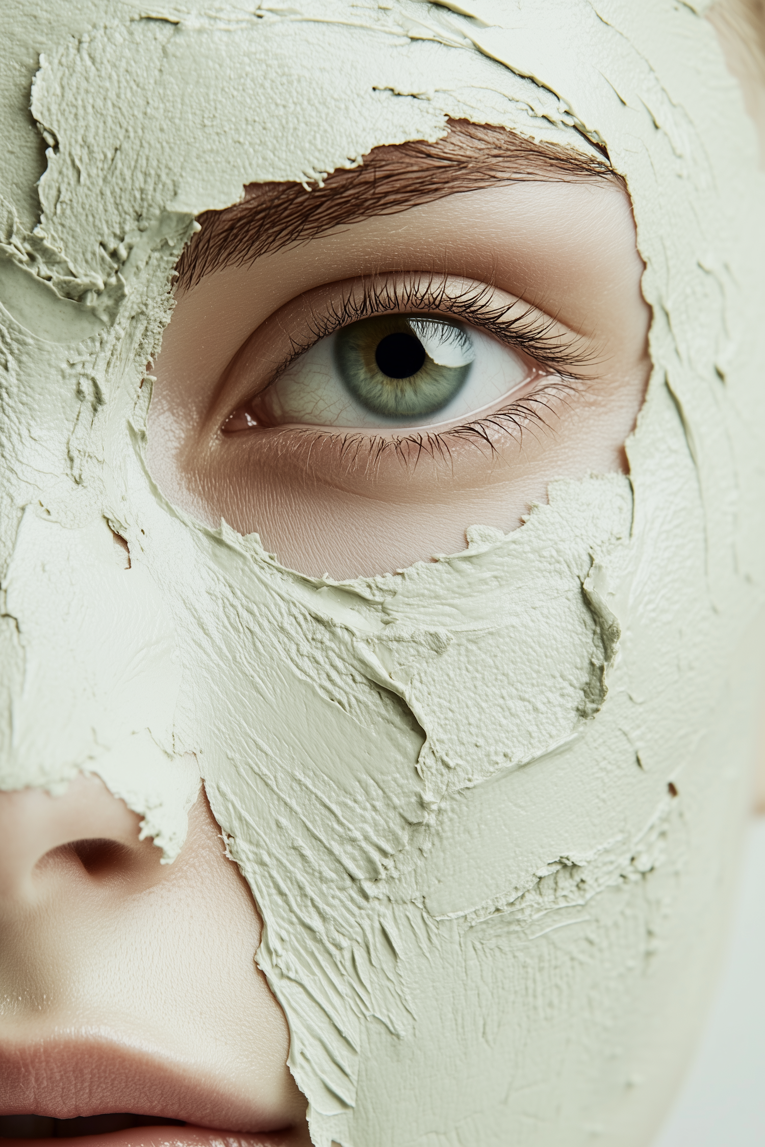 Close-up of a face with a green clay mask, highlighting a blue eye and smooth skin. Perfect for skincare and beauty themes.