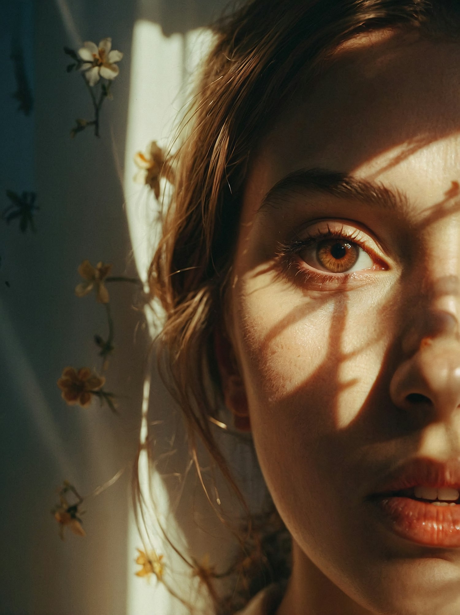 Close-up portrait of a woman with hazel eyes and sunlight casting shadows on her face, surrounded by small yellow flowers.