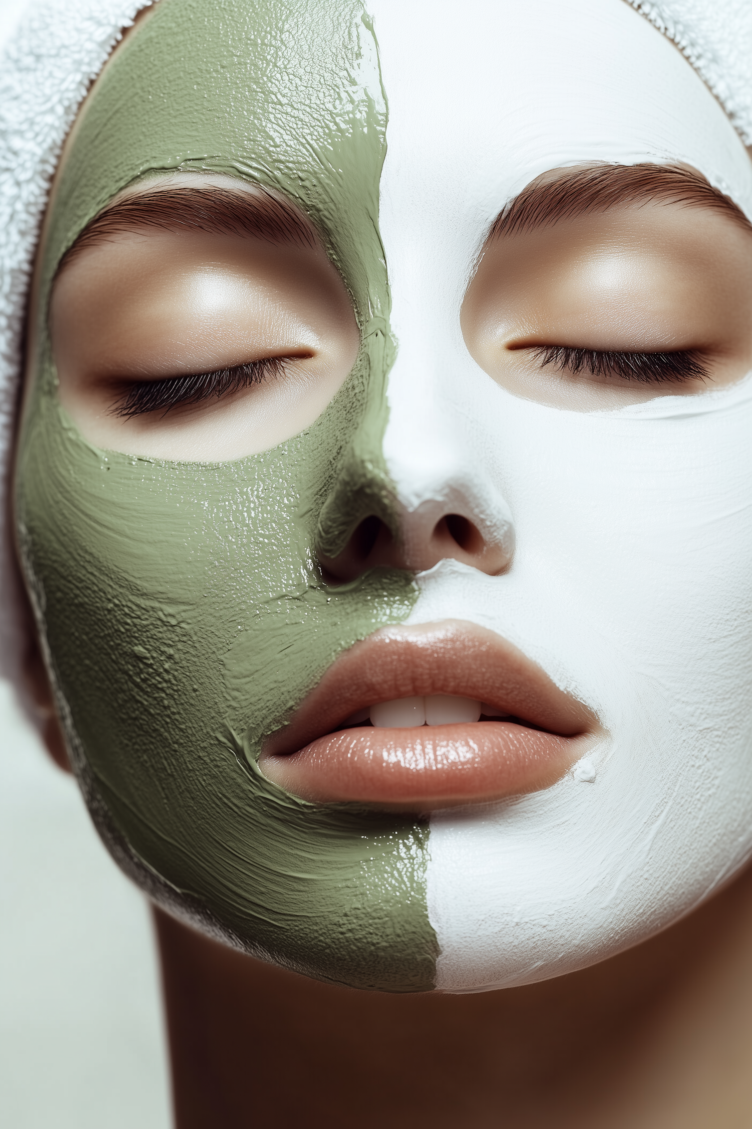 Close-up of a woman's face with green and white facial masks, eyes closed, serene expression, towel wrapped around head.