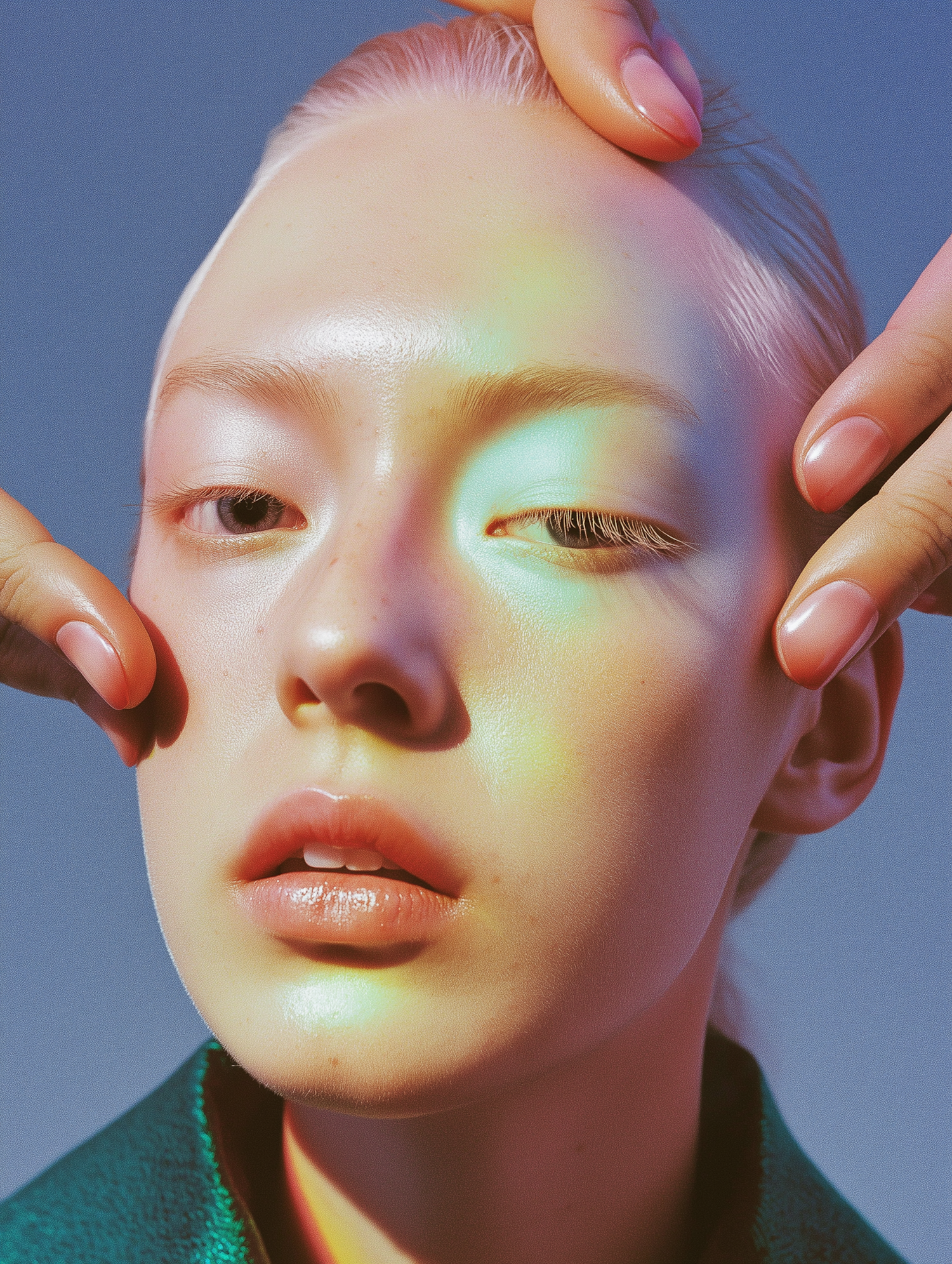 Artistic close-up of a woman's face with rainbow light reflections and gentle hands touching her skin, creating a serene and colorful scene.