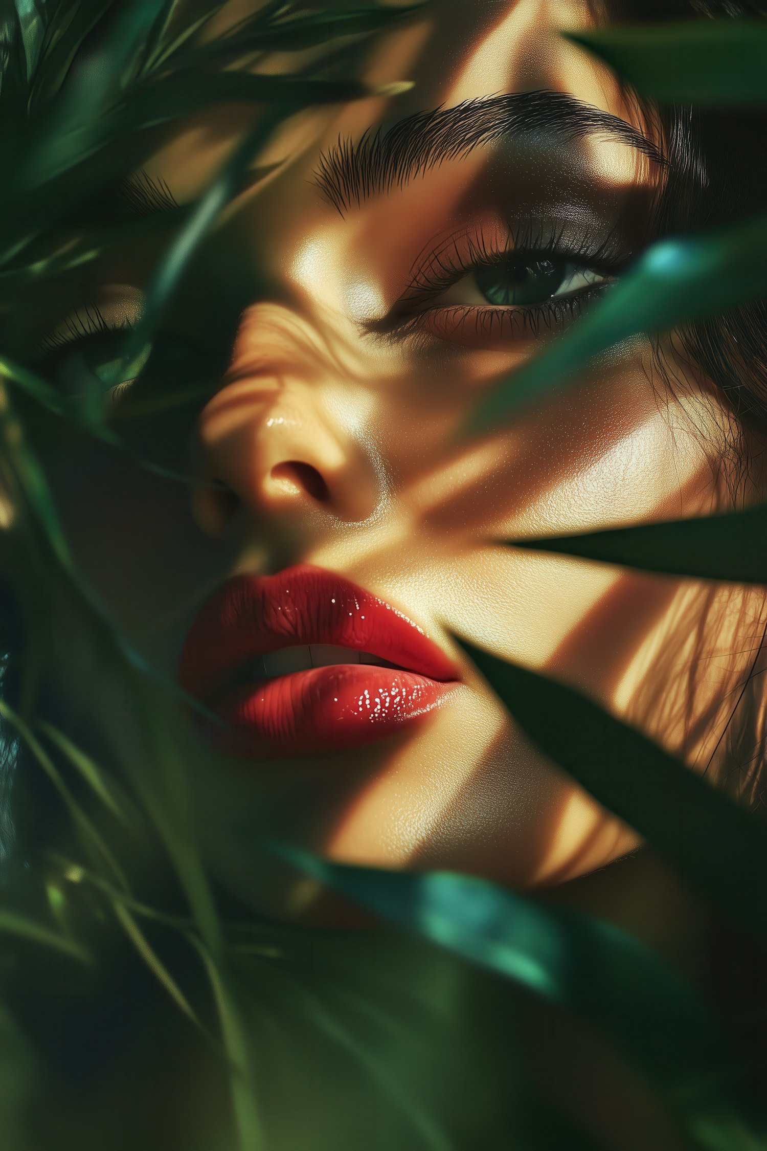 Close-up of a woman's face with glossy red lips, surrounded by green leaves and dramatic sunlight, creating a mysterious allure.
