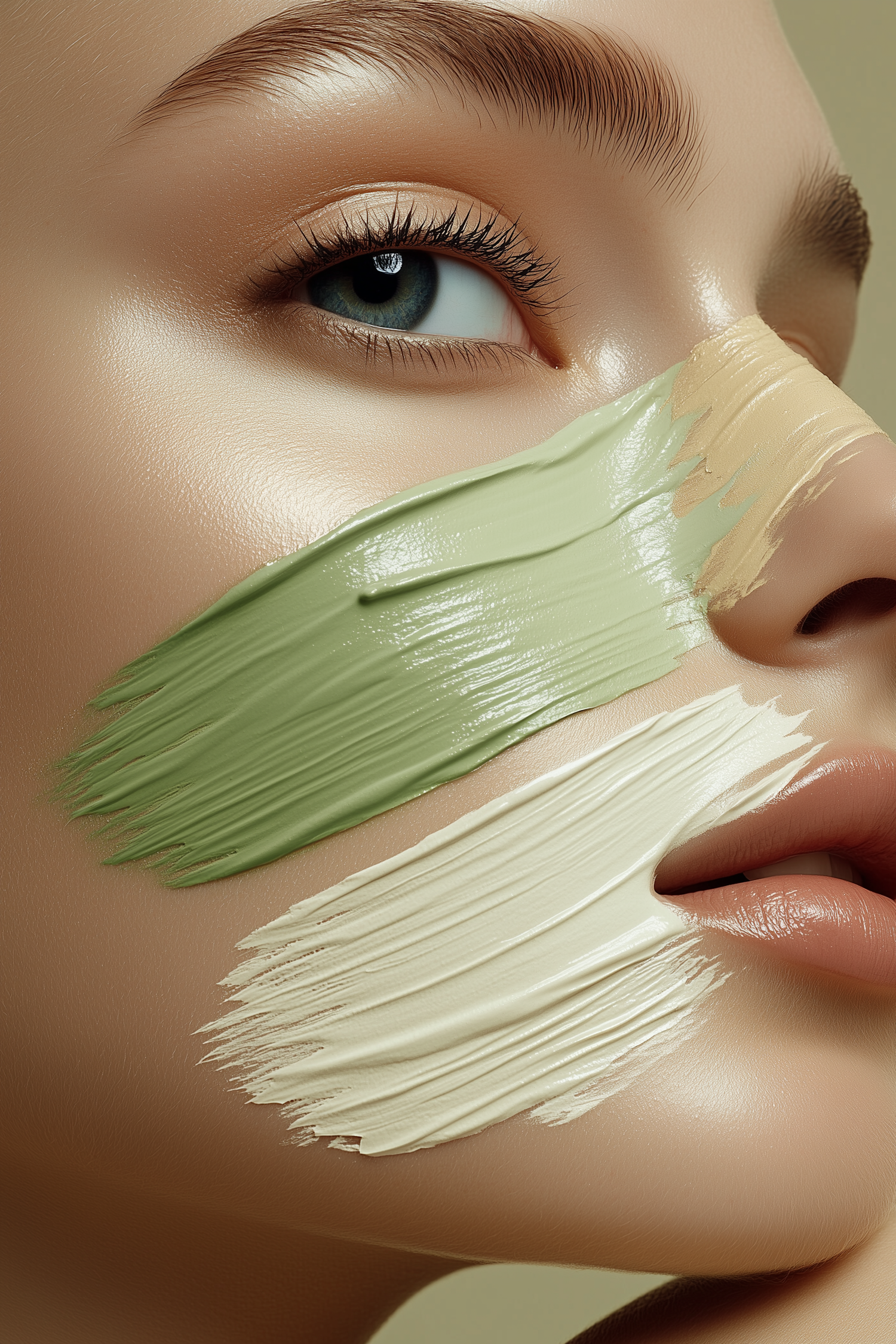 Close-up of a woman's face with artistic swipes of green, beige, and white cream on her cheek, highlighting her blue eyes.