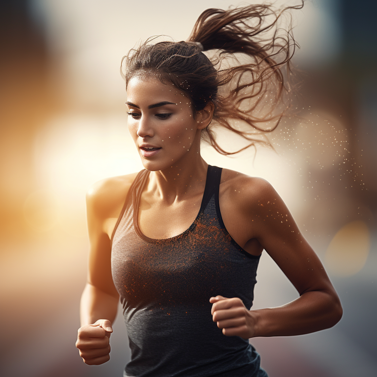 Focused woman running at sunrise, hair flying in motion, wearing a gray tank top, with warm golden tones in the background.