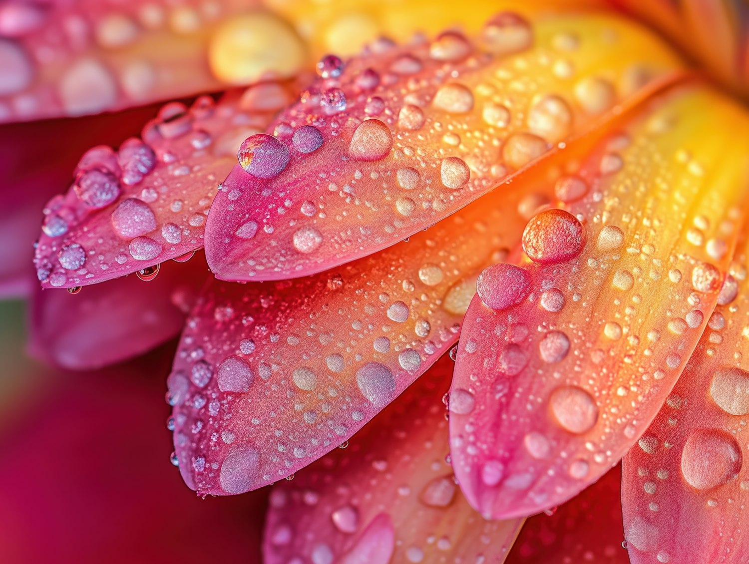 Close-up of colorful flower petals with dewdrops, showcasing vibrant pink and yellow hues and glistening water droplets.