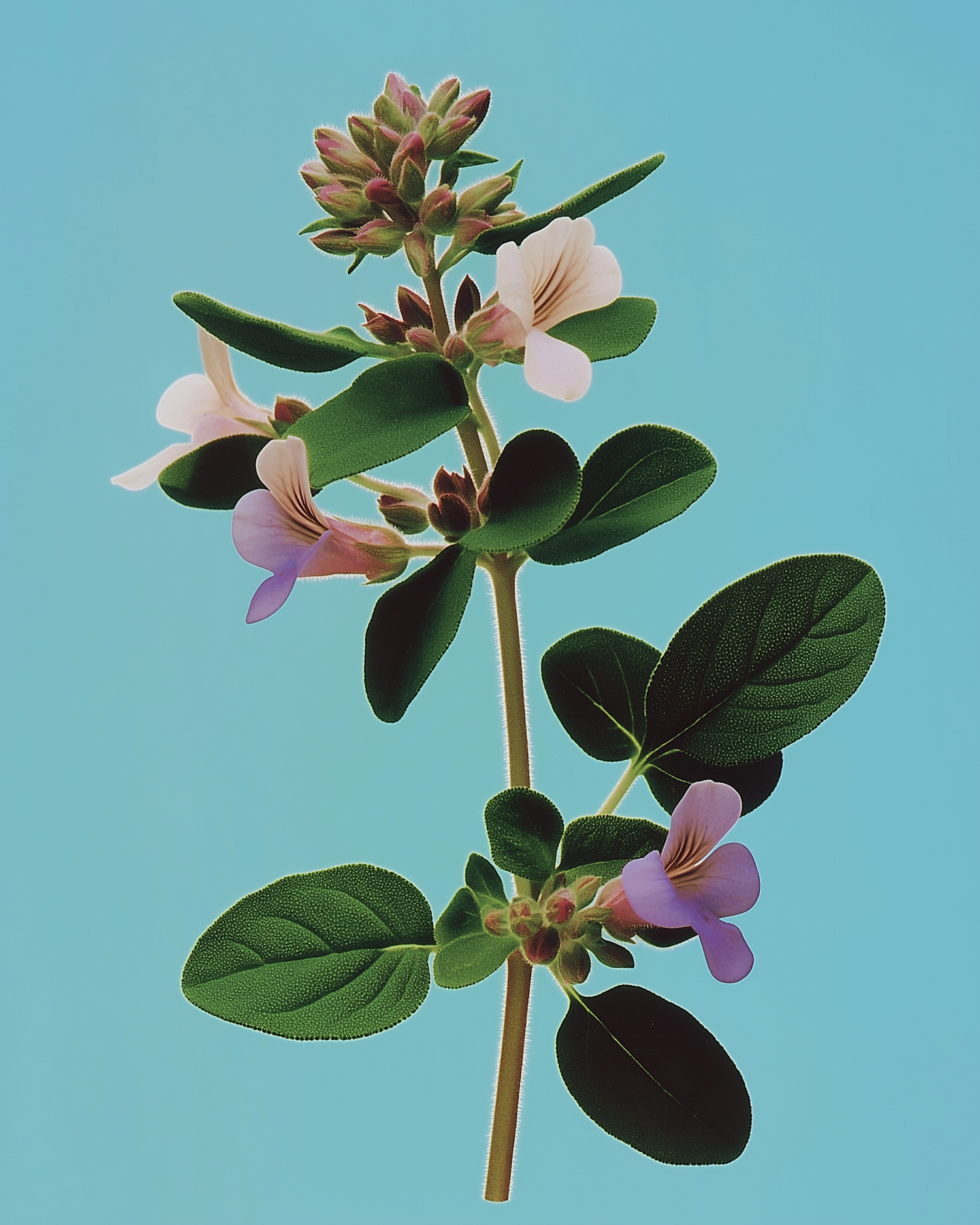 Vibrant green leaves and pink flowers on a slender stem against a bright blue background, creating a fresh and lively composition.