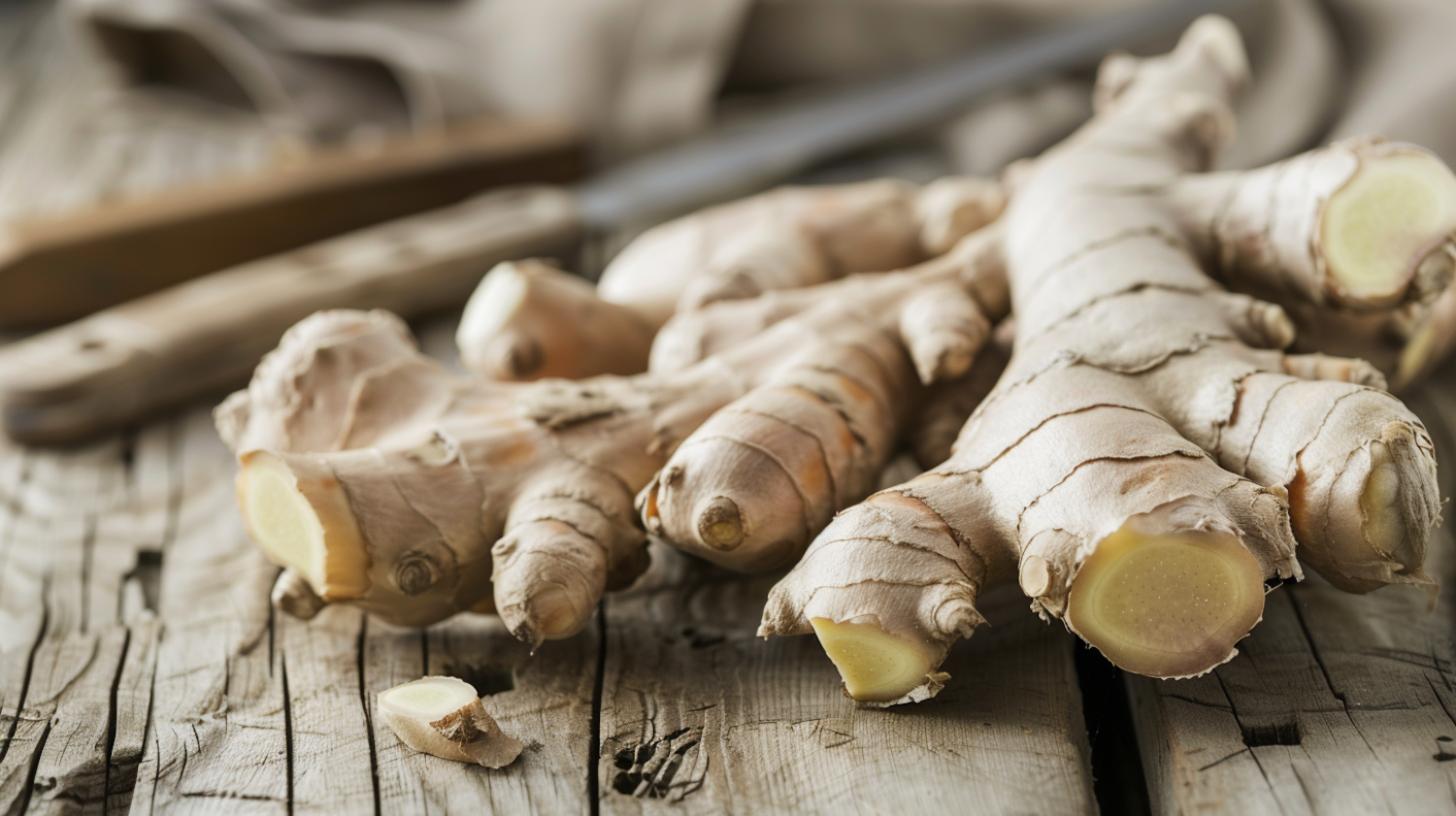 Close-up of fresh ginger roots on a rustic wooden surface, highlighting their texture and natural color.