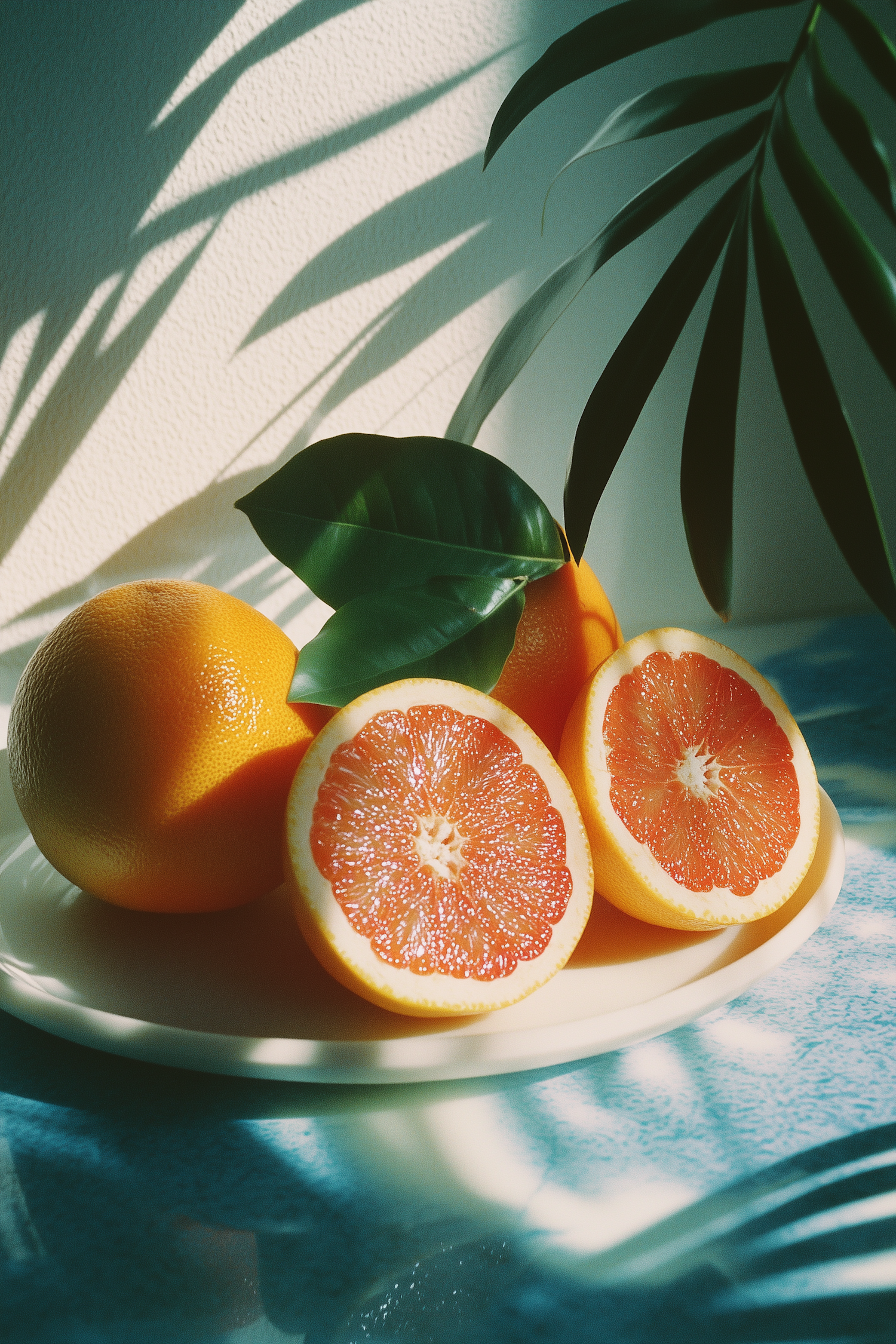Fresh grapefruits with green leaves on a plate, highlighted by palm leaf shadows and natural light, creating a tropical vibe.