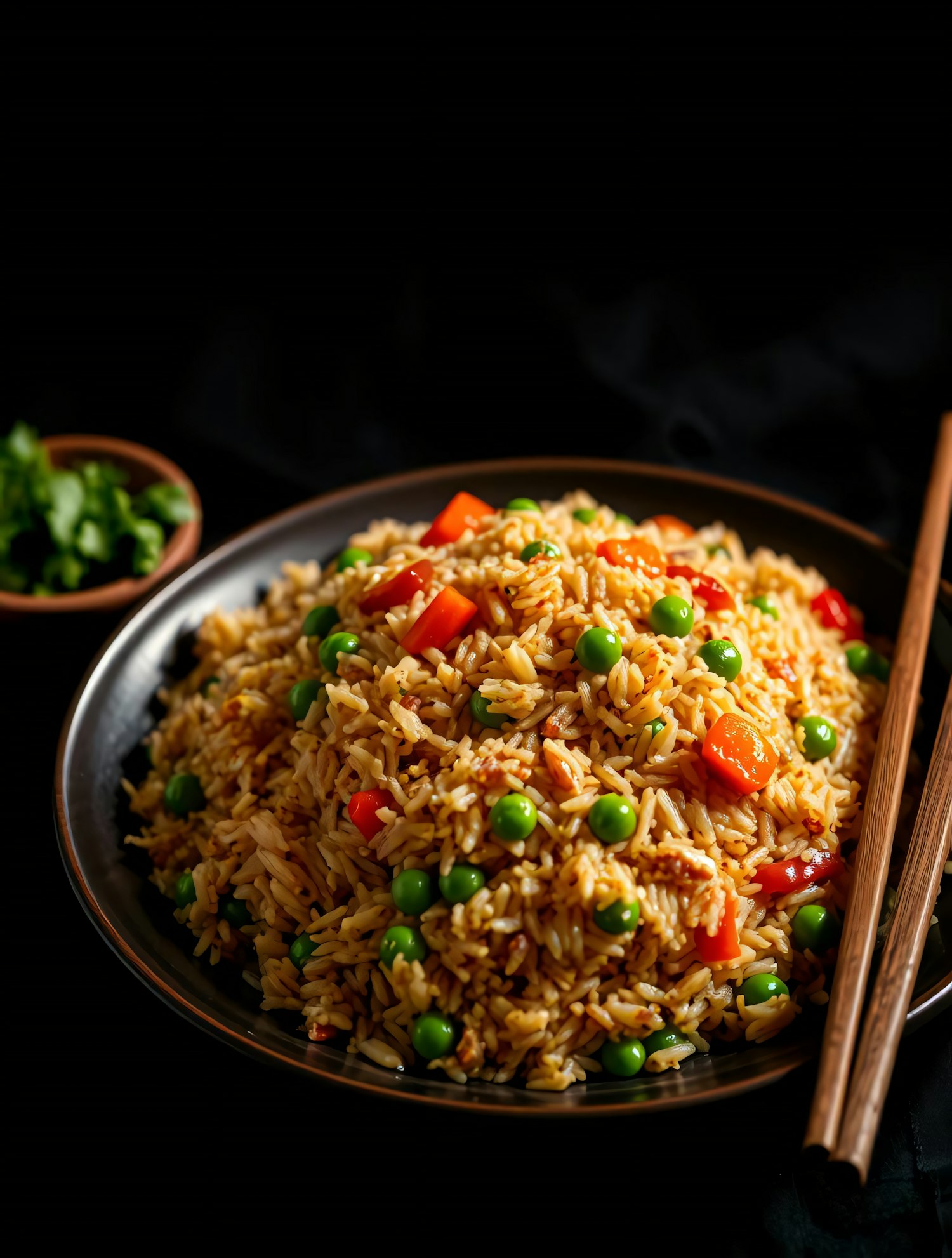 Delicious fried rice with peas, carrots, and red peppers served on a dark plate with chopsticks, perfect for an Asian-inspired meal.