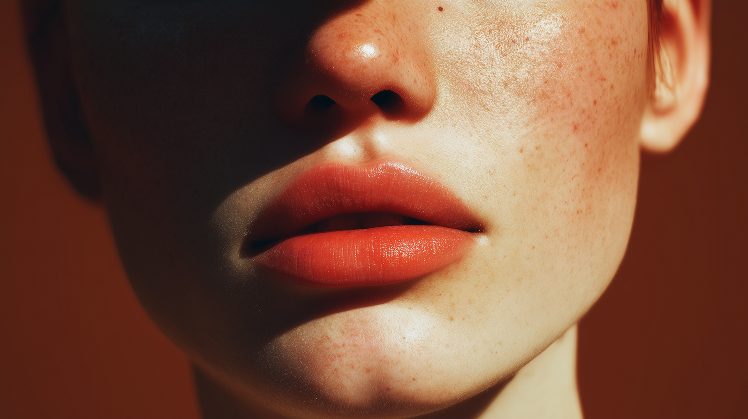 Close-up of vibrant orange-red lips with freckled skin in warm lighting, showcasing natural beauty and texture.
