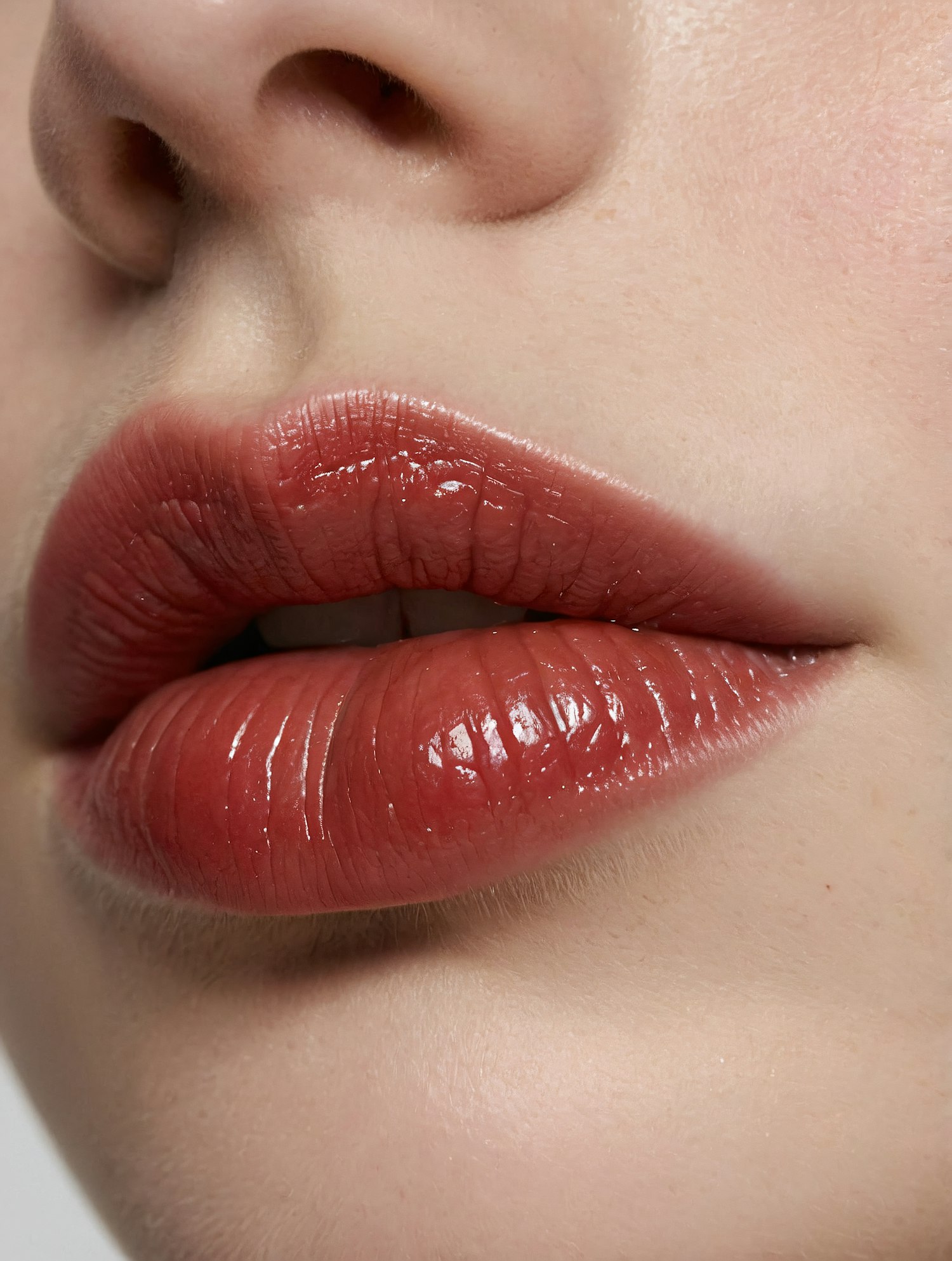 Close-up of glossy red lips with smooth skin, highlighting beauty and allure.