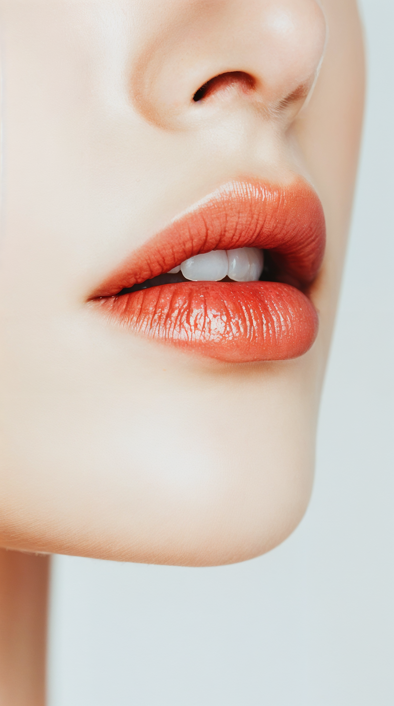Close-up of glossy red lips and a smooth nose, highlighting vibrant lipstick and flawless skin texture.
