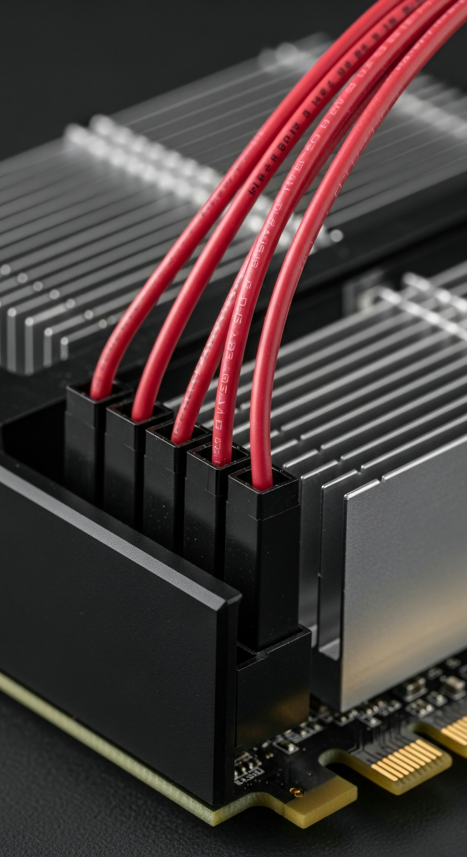 Close-up of a computer component with red power cables and a metallic heatsink, showcasing intricate hardware details.