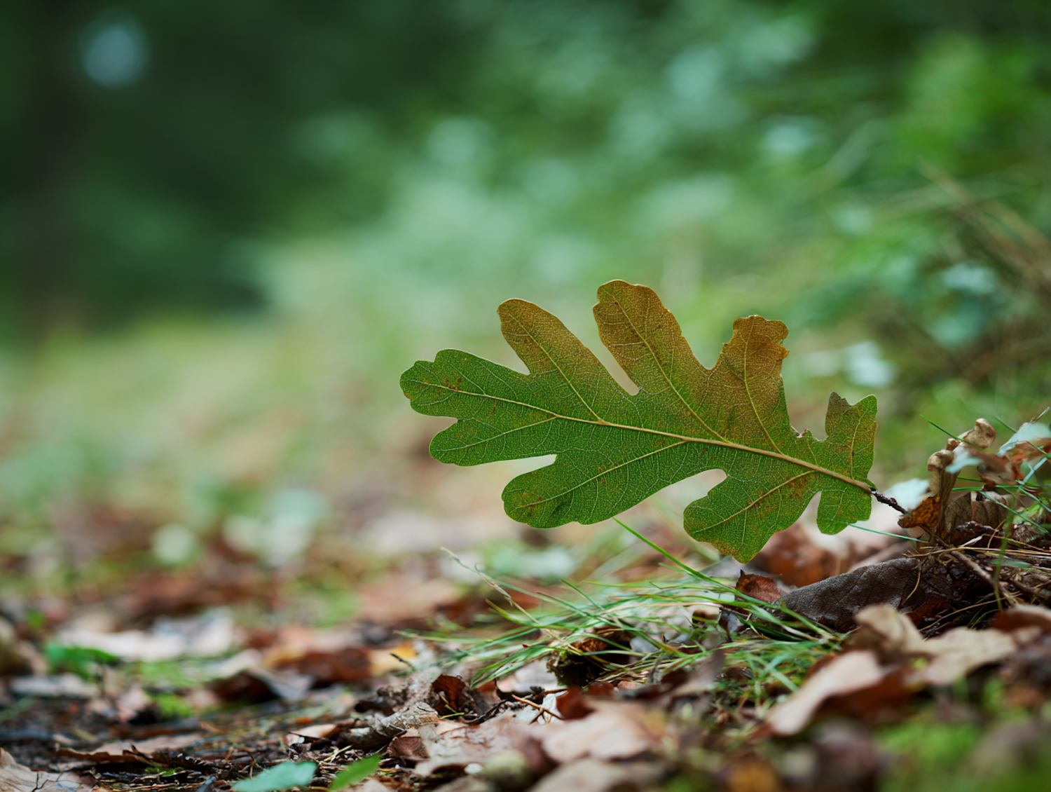 Close-up of a vibrant green oak leaf amidst a soft, blurred forest background, highlighting its intricate veins and natural texture.