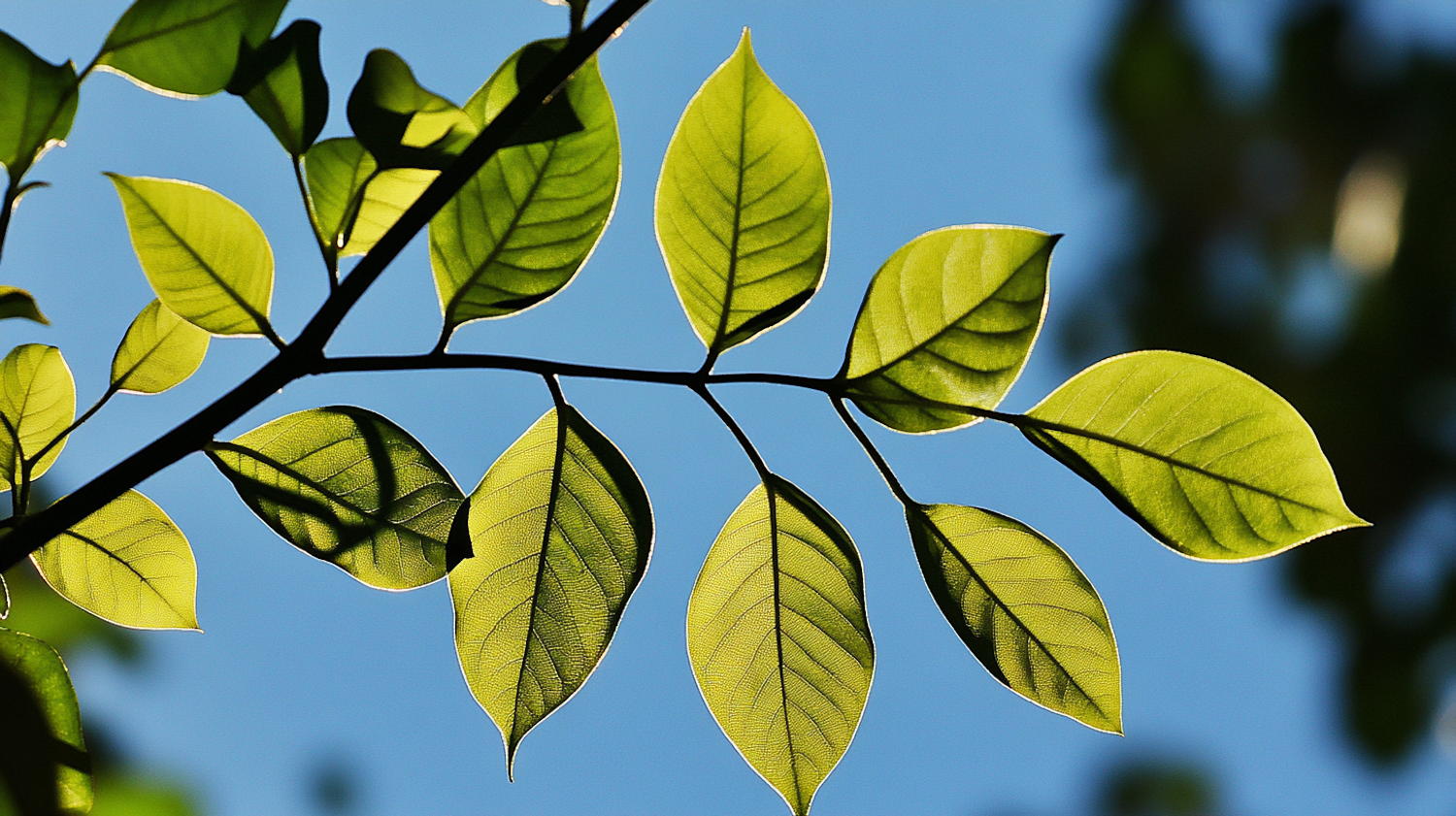Vibrant green leaves on a branch against a clear blue sky, showcasing sunlight filtering through the leaf veins.