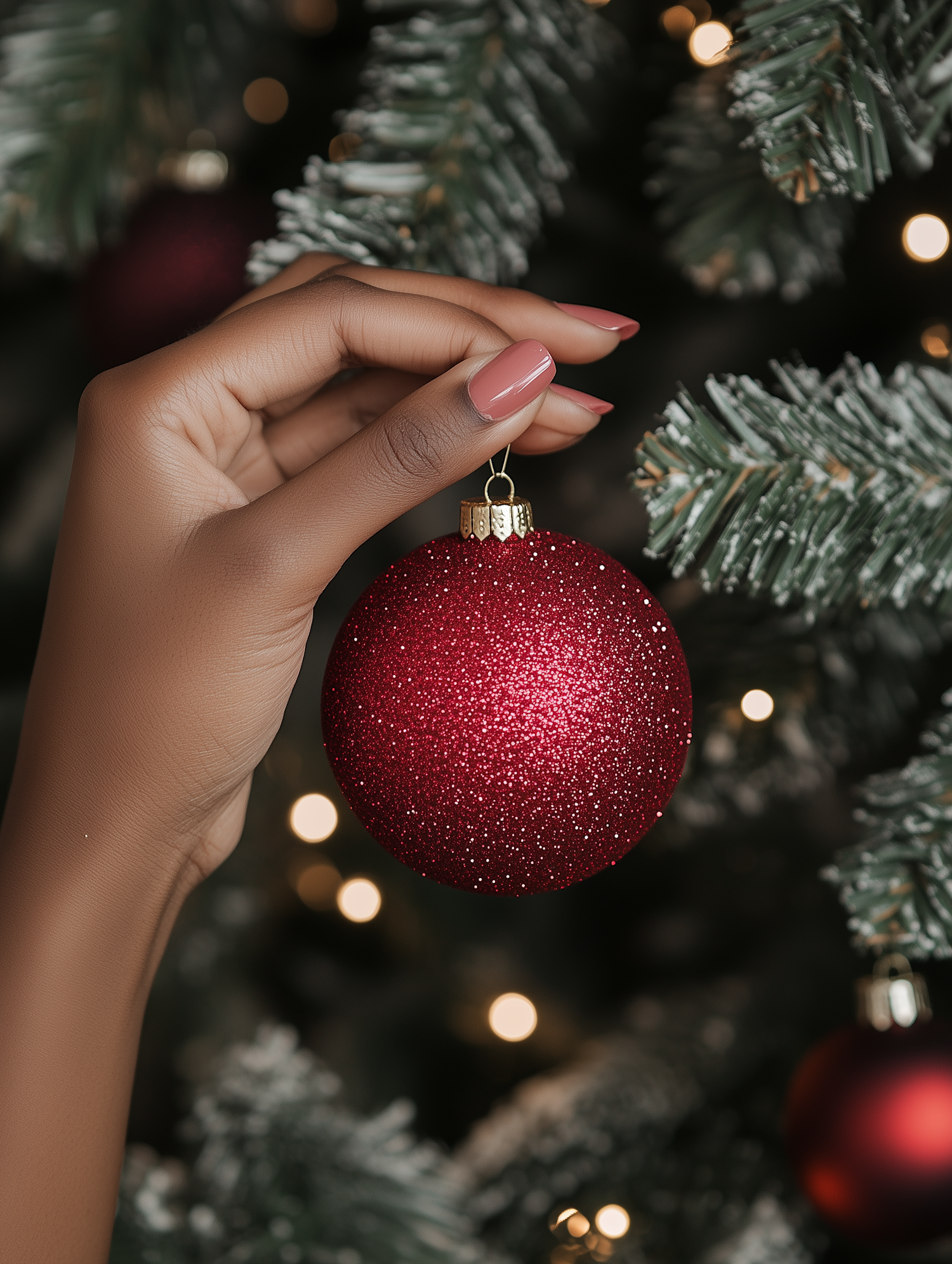 Elegant hand with pink nails holding a glittery red Christmas ornament against a festive pine tree background.