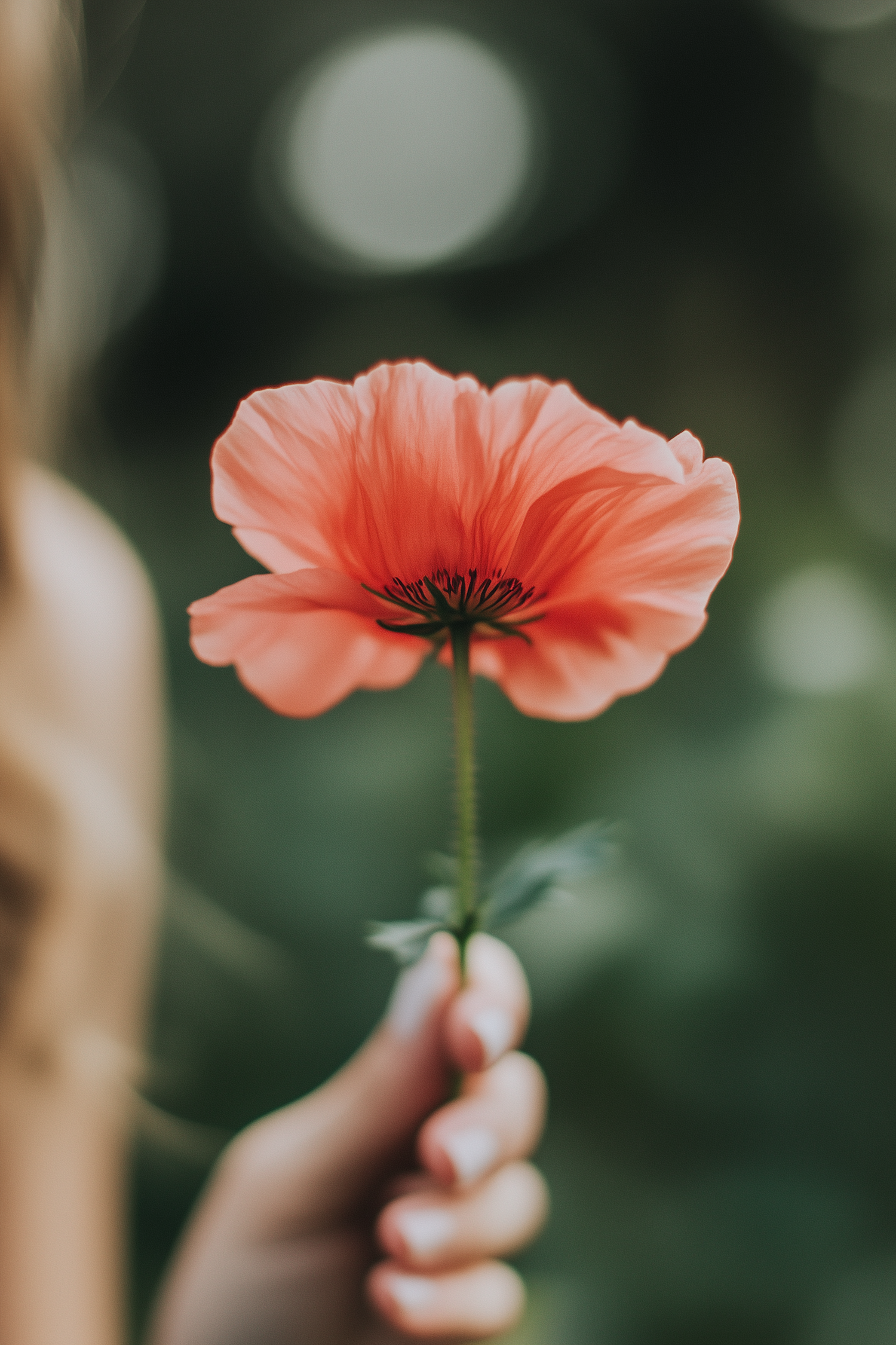 A hand gently holds a vibrant coral poppy against a blurred green background, highlighting the flower's delicate beauty.