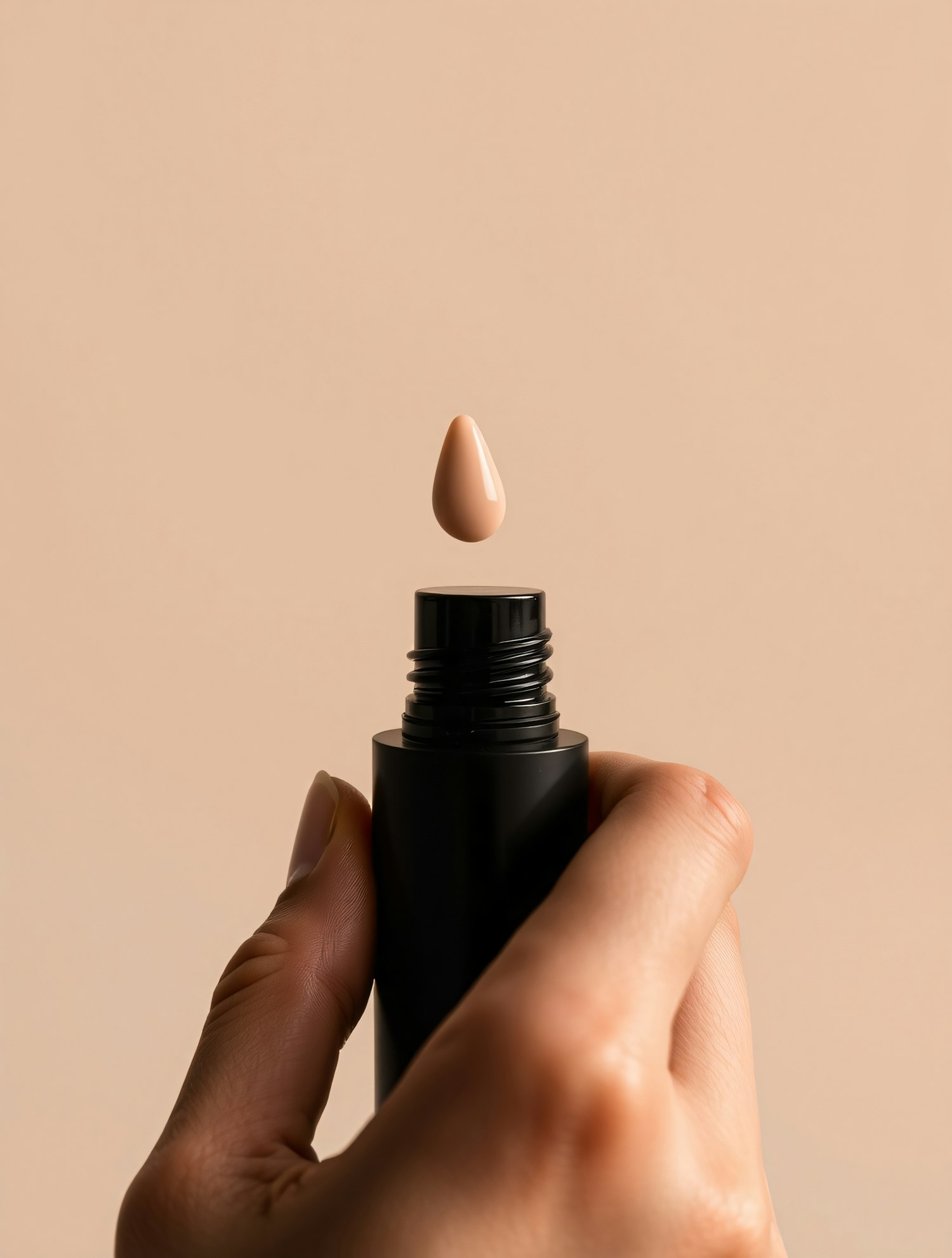 Close-up of a hand holding a black bottle with a drop of beige liquid suspended above, set against a beige background.