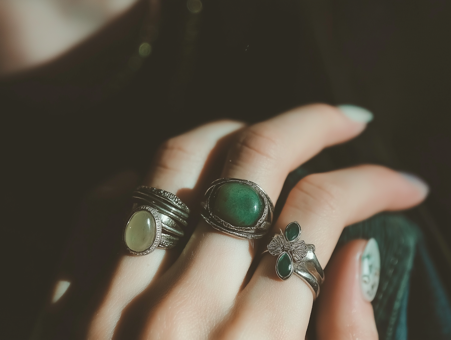 Close-up of a hand with ornate silver rings featuring green and pale stones, set against a dark background.