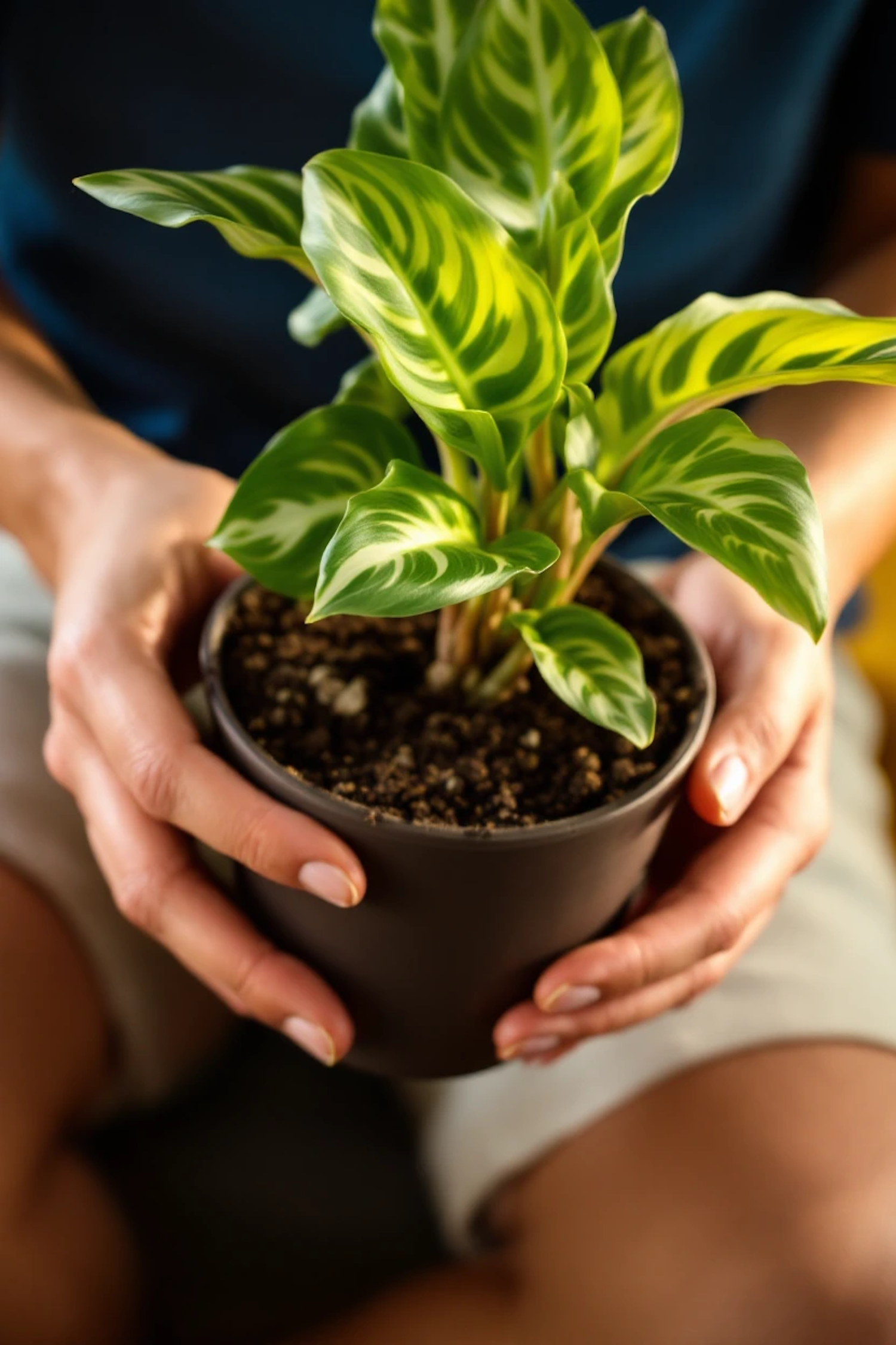 Hands holding a potted plant with vibrant green leaves and striking patterns, set against a softly blurred background.