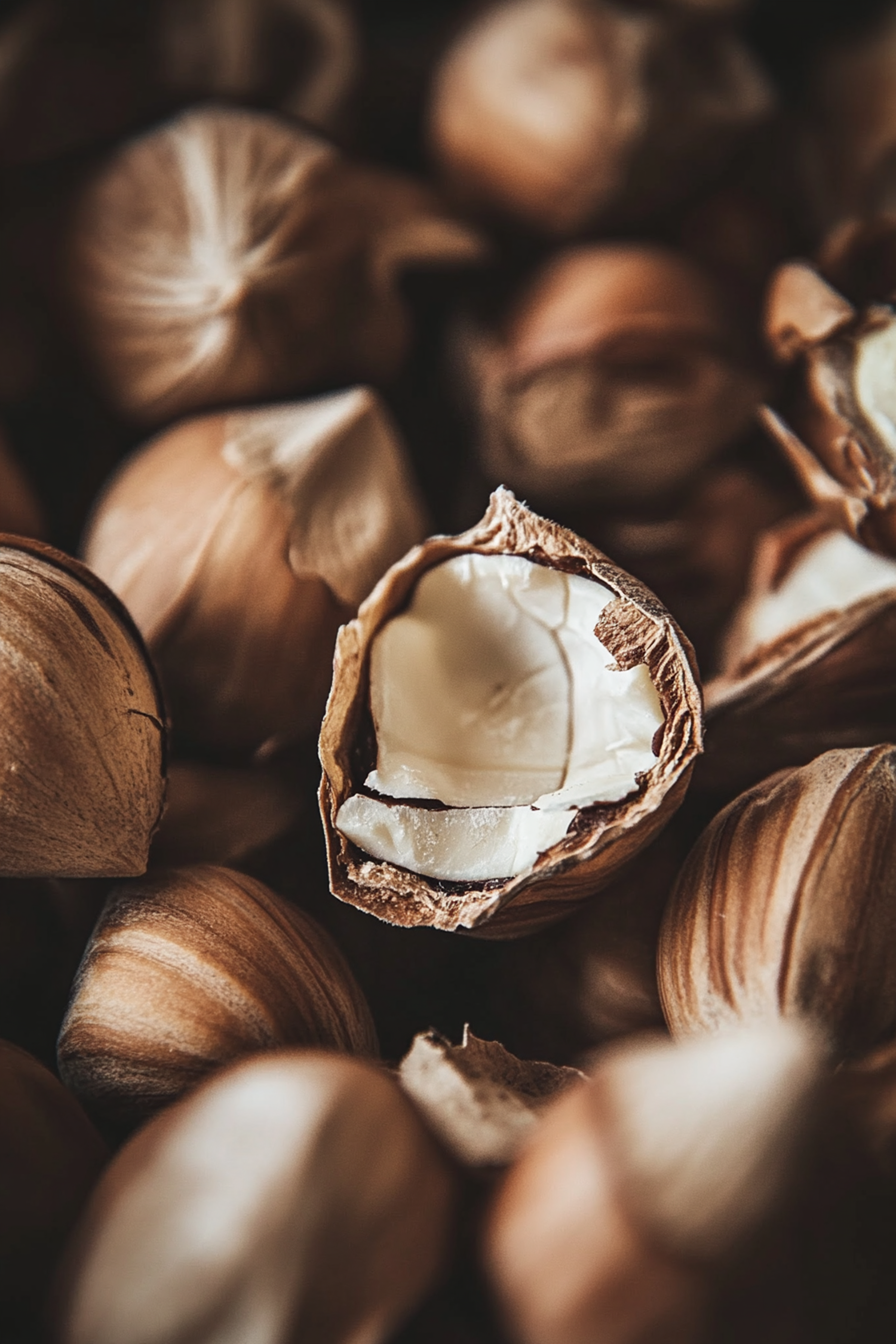 Close-up of cracked open hazelnut revealing creamy white nut inside, surrounded by whole hazelnuts in earthy tones.