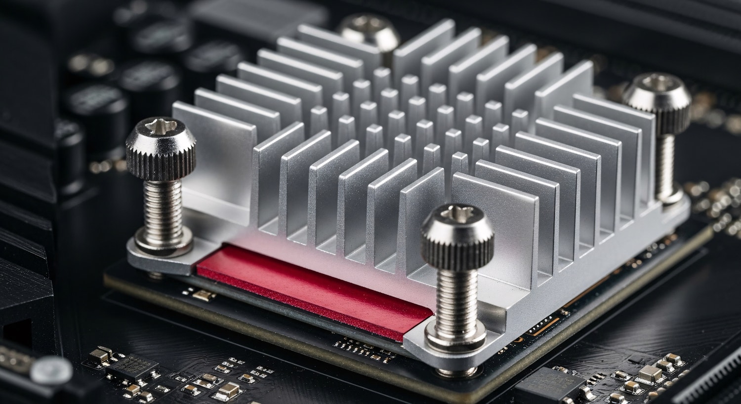 Close-up of a silver heatsink on a circuit board, secured with screws, showcasing intricate details of electronic components.