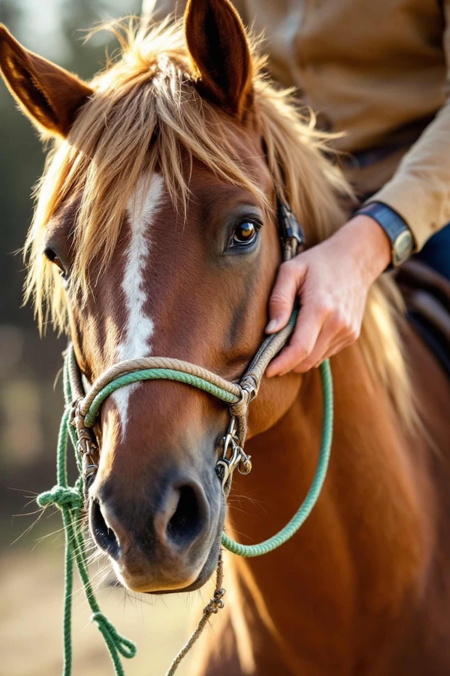 Close-up of a chestnut horse with a white blaze, held by a person in a brown jacket. Warm lighting highlights the horse's expressive eyes.