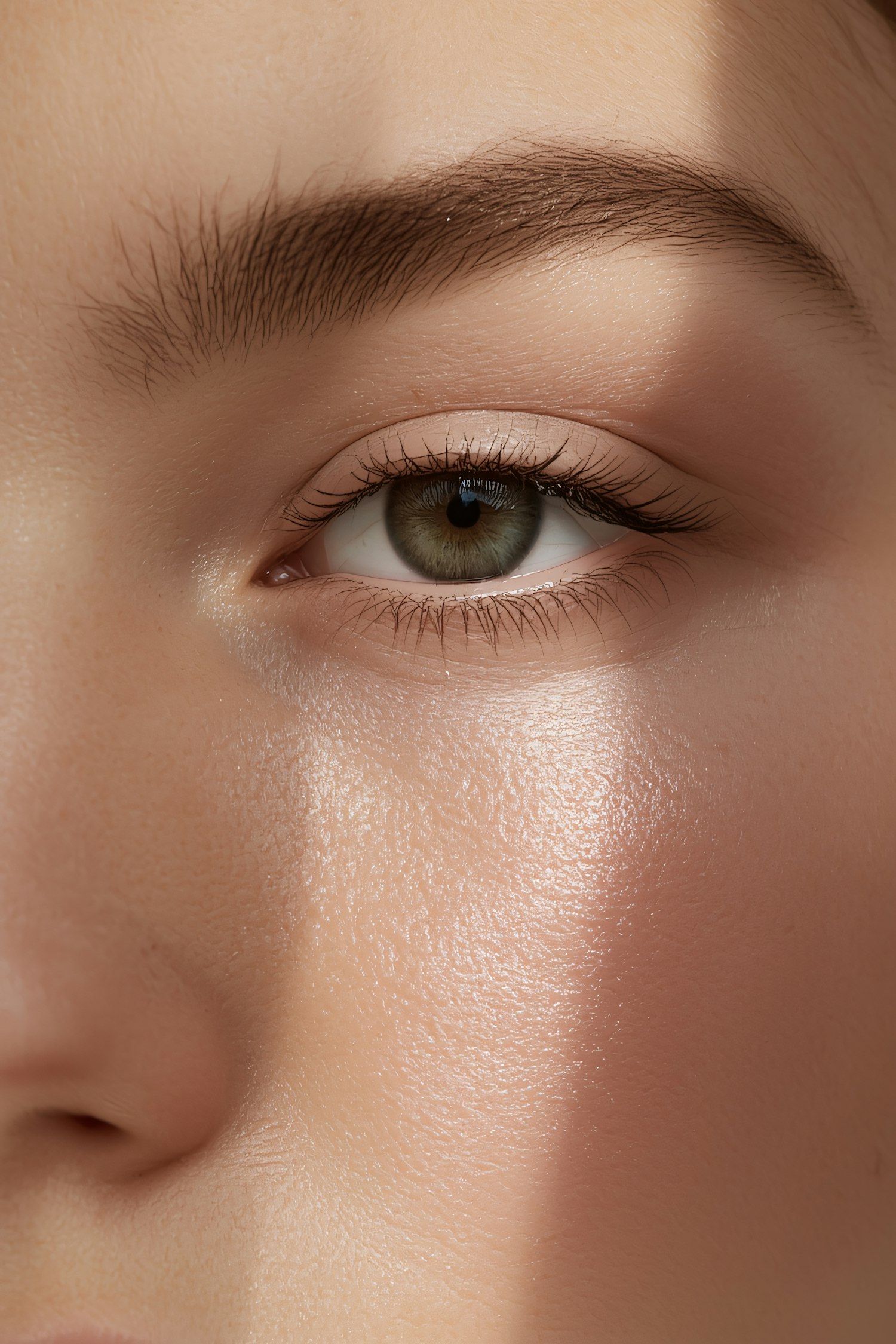 Close-up of a green eye with detailed iris and natural lashes, illuminated by soft light highlighting smooth skin and a well-groomed eyebrow.