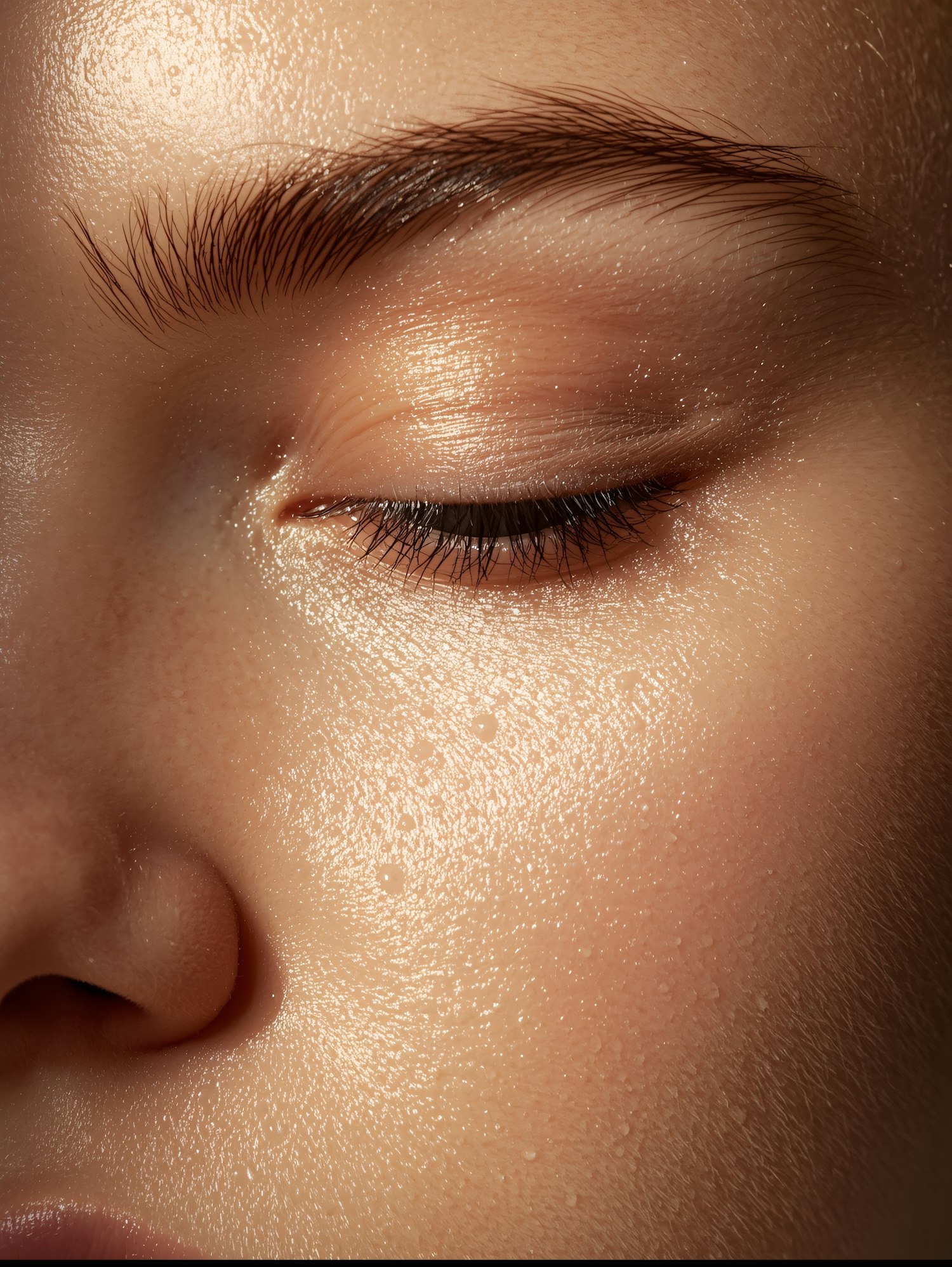Close-up of a closed eye with glowing, dewy skin and detailed eyebrow texture, showcasing natural beauty and skin texture.