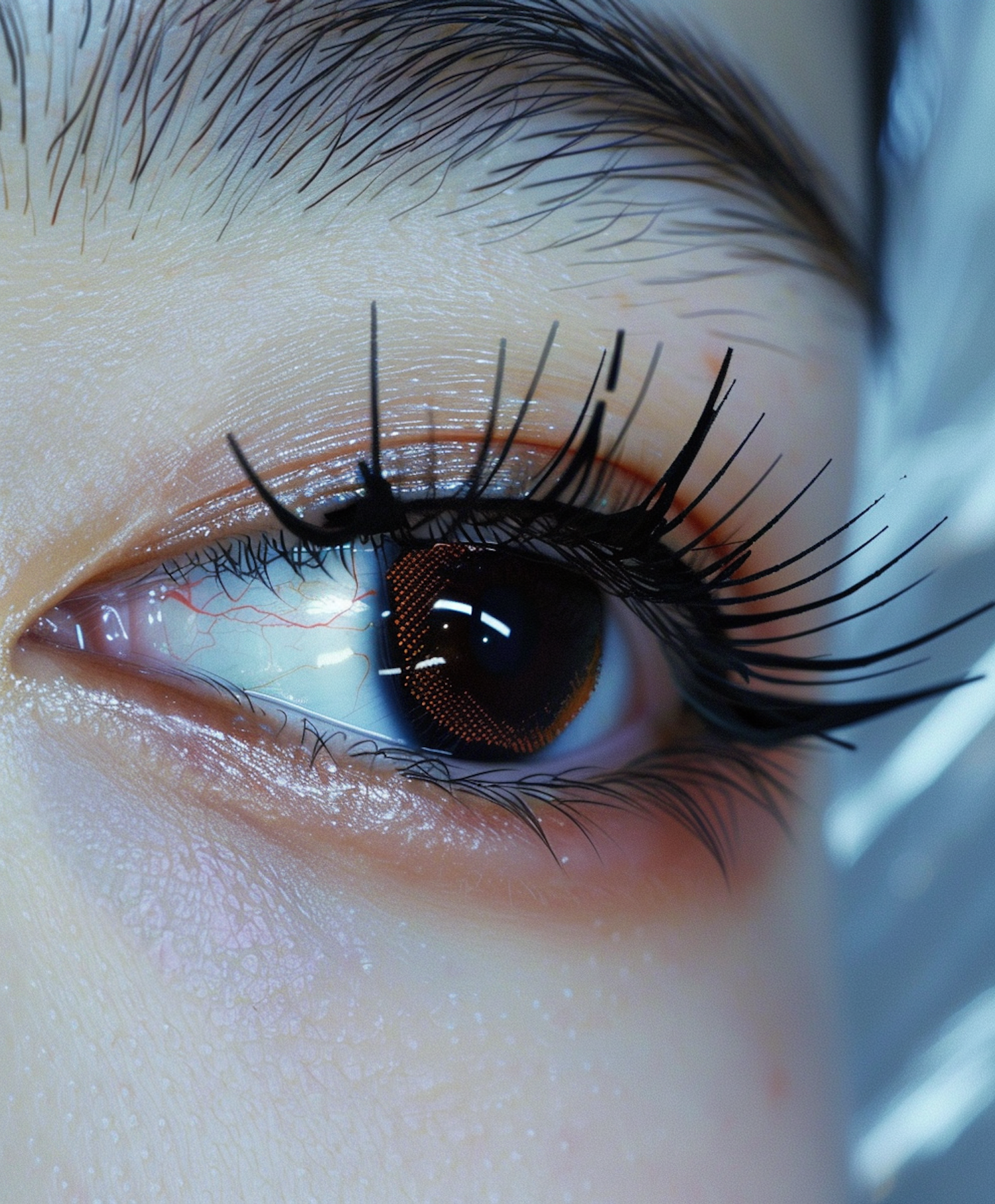 Close-up of a brown eye with long eyelashes, reflecting light. Detailed skin texture and soft lighting enhance the natural beauty.
