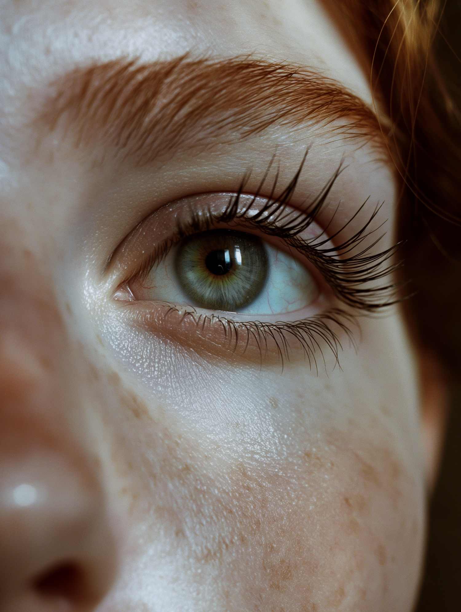 Close-up of a green eye with long lashes and freckles on fair skin, highlighting natural beauty and detail.