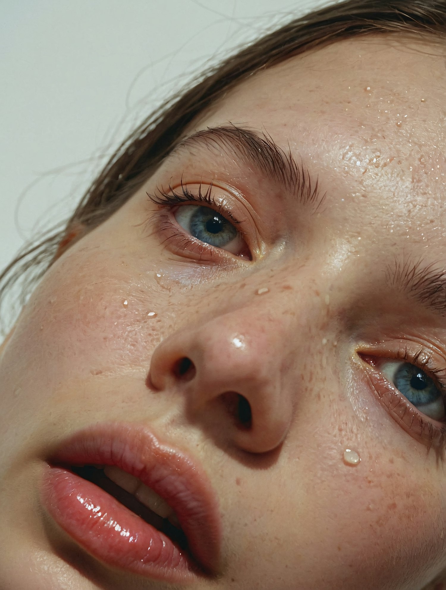 Close-up of a young woman with dewy skin and blue eyes, showcasing natural beauty and freshness.