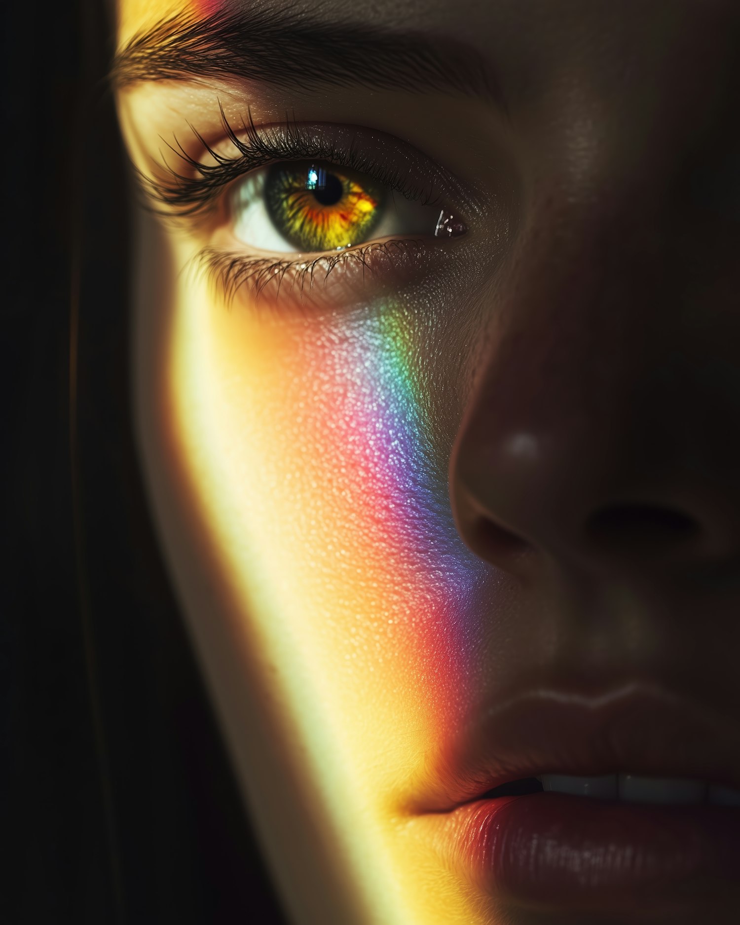Close-up of a green eye with golden hues, rainbow light on skin, and detailed facial features in a dark background.