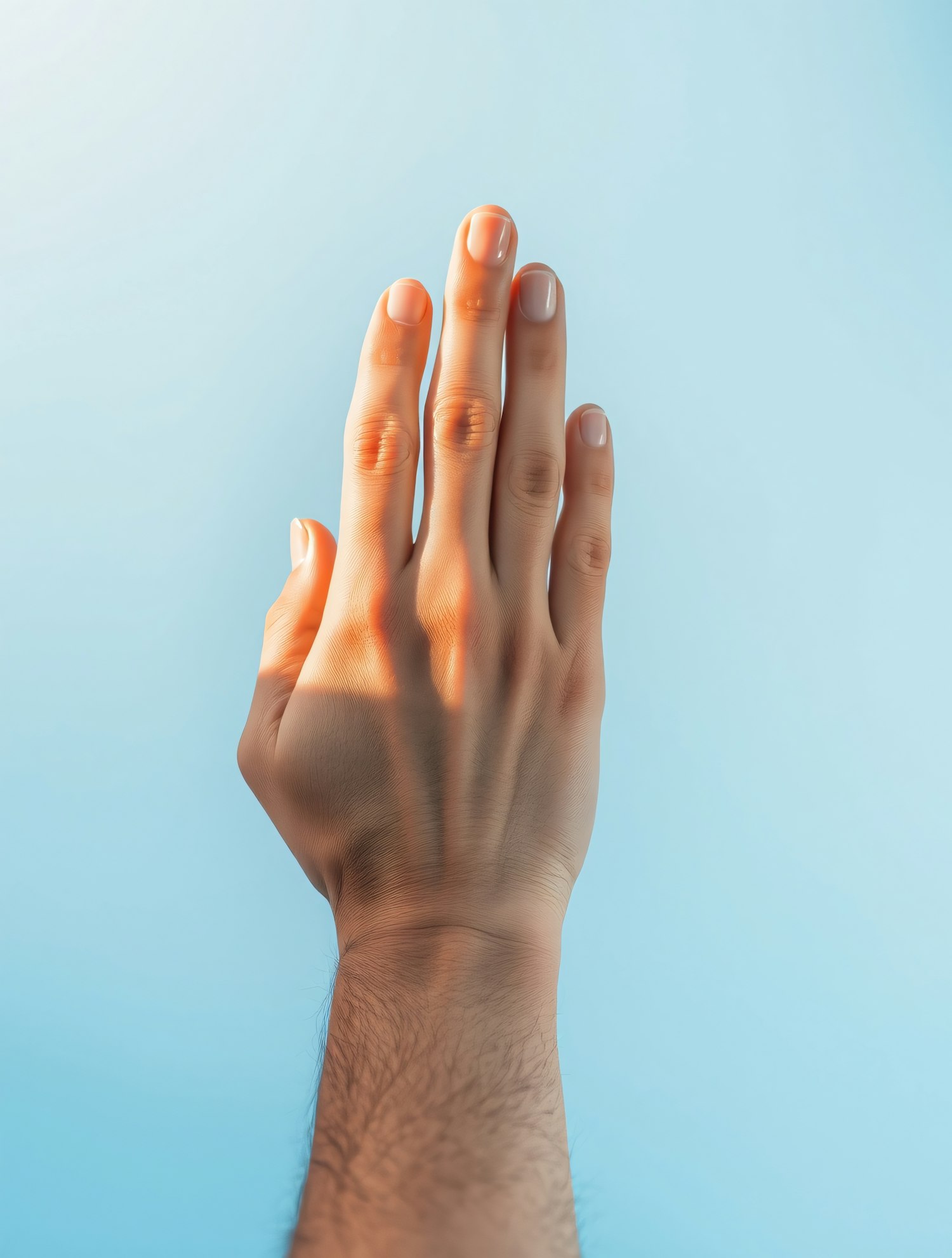 Close-up of a light-skinned hand with clean nails against a blue background, showcasing natural texture and soft lighting.