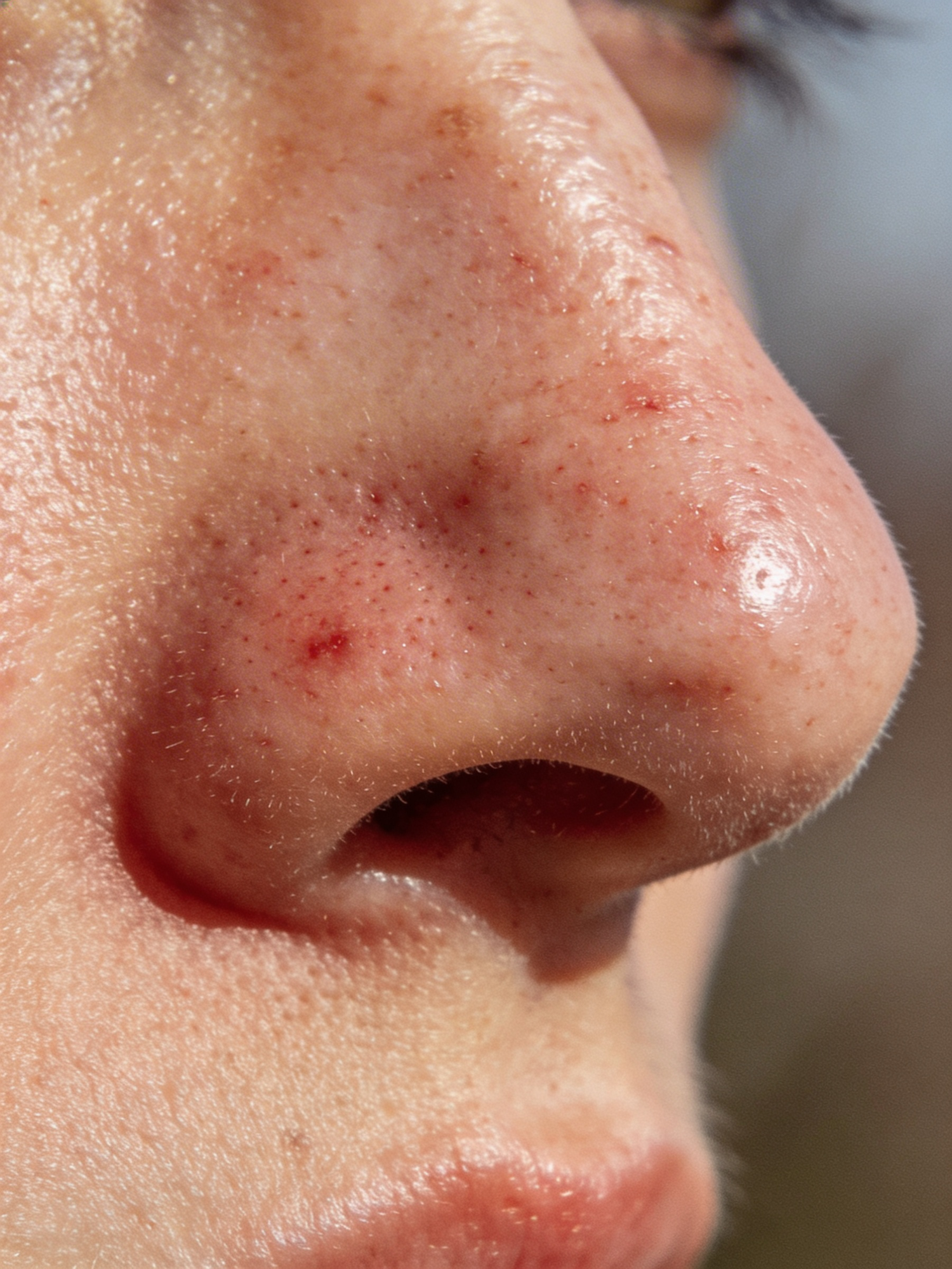 Close-up of a human nose with visible skin texture and pores, highlighting natural details and contours under soft lighting.