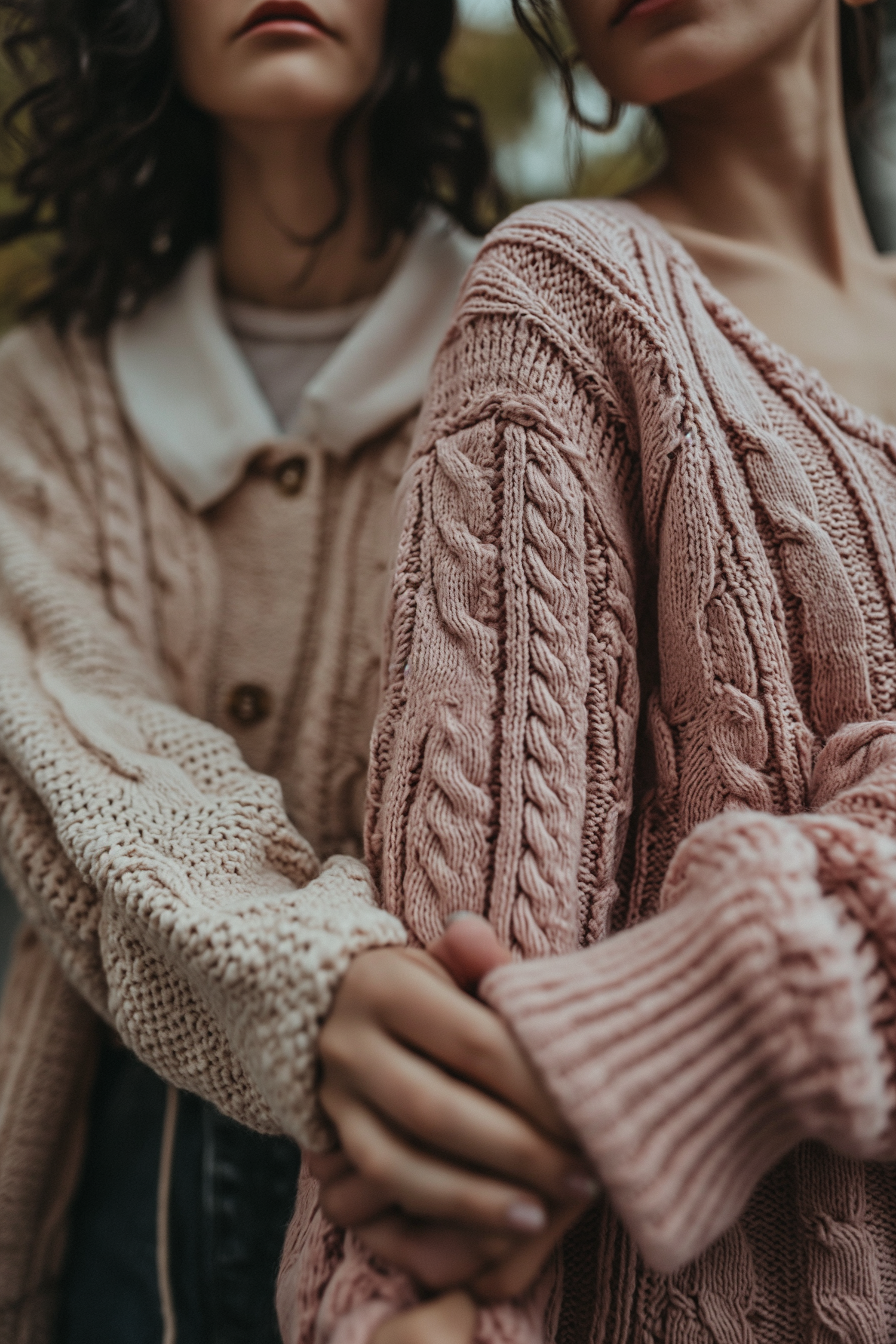 Two women in cozy knitted sweaters hold hands, showcasing soft textures and muted colors, emphasizing warmth and connection.
