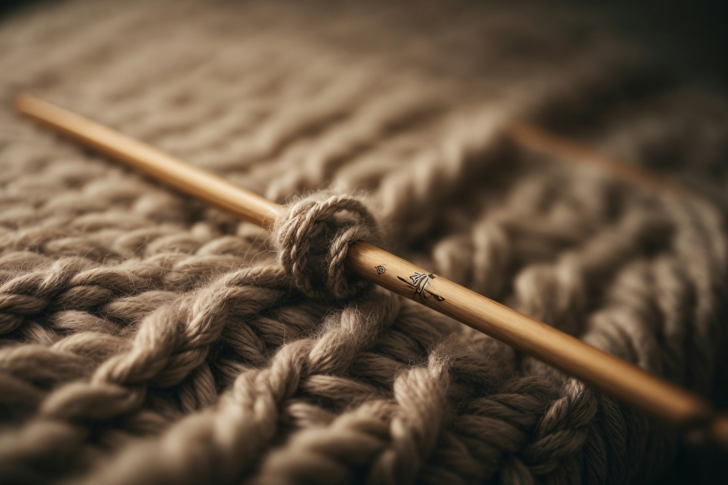 Close-up of a wooden knitting needle with thick brown yarn, showcasing texture and craftsmanship in a cozy setting.