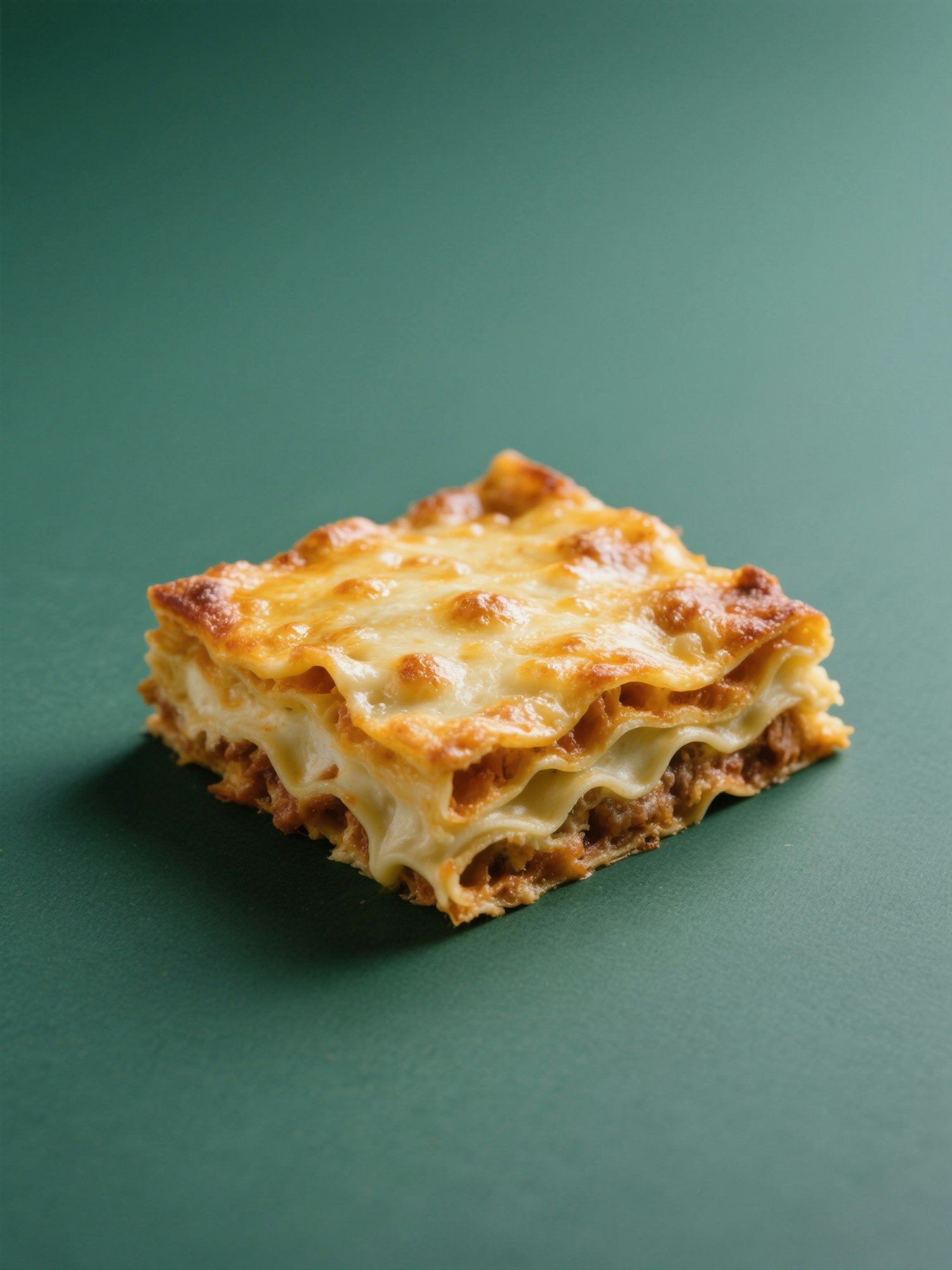 A delicious slice of lasagna with golden-brown cheese and layered pasta on a green background, perfect for food lovers.