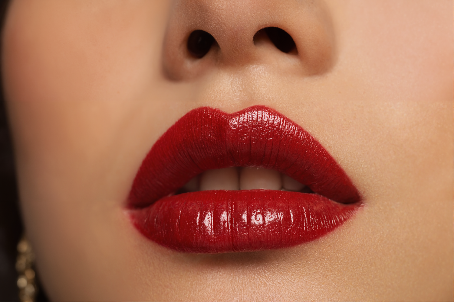 Close-up of glossy red lips with vibrant lipstick, highlighting smooth skin and bold color contrast.