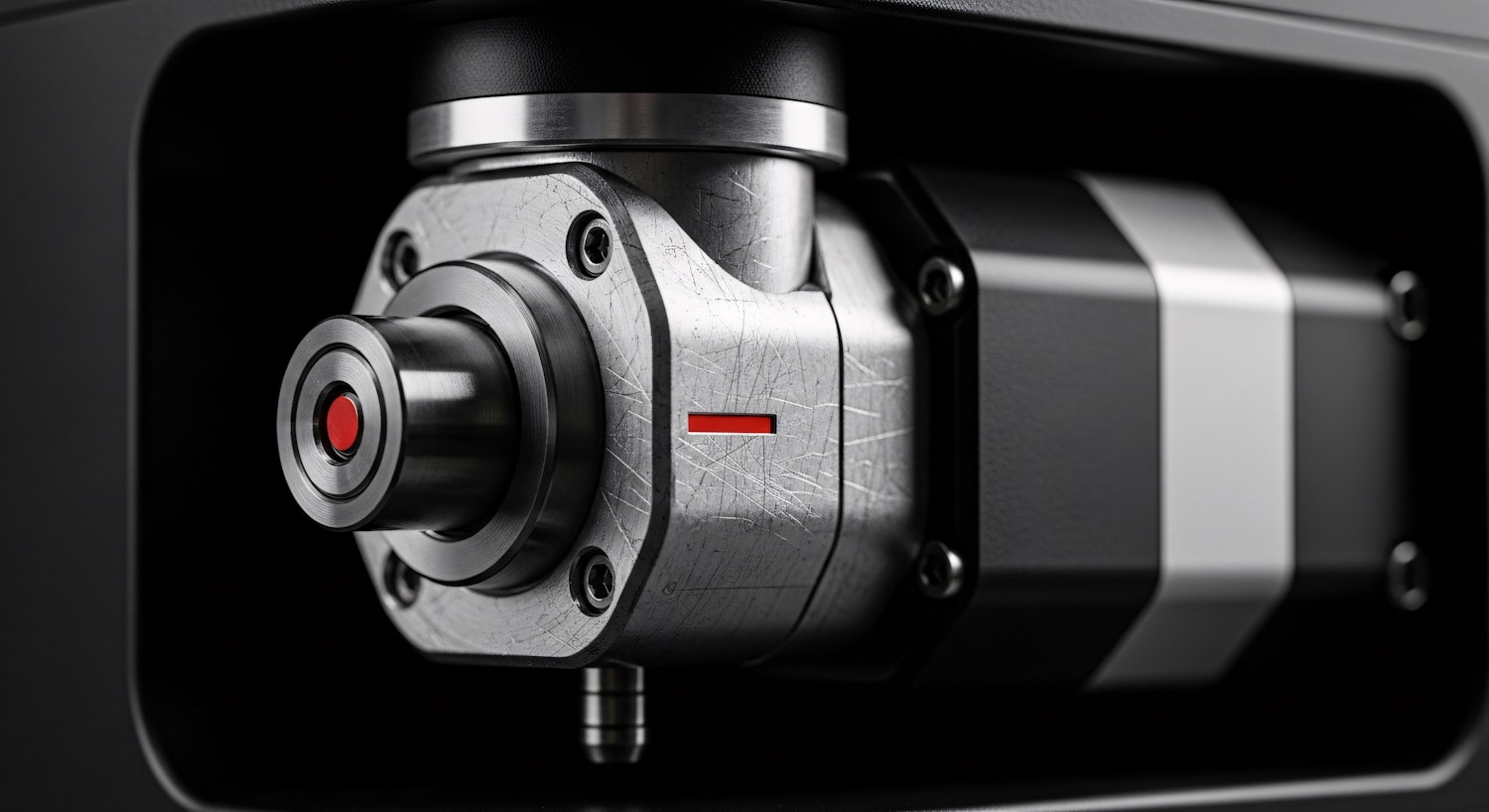 Close-up of a metallic industrial component with a polished cylindrical detail and visible wear marks, showcasing precision engineering.