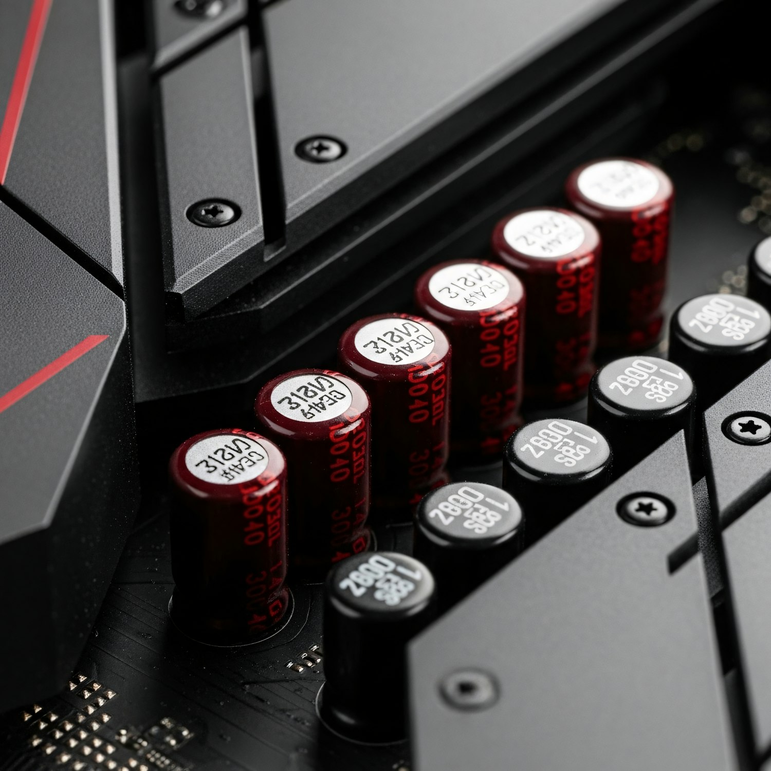 Close-up of capacitors on a computer motherboard, showcasing intricate details of the electronic components and their alignment.
