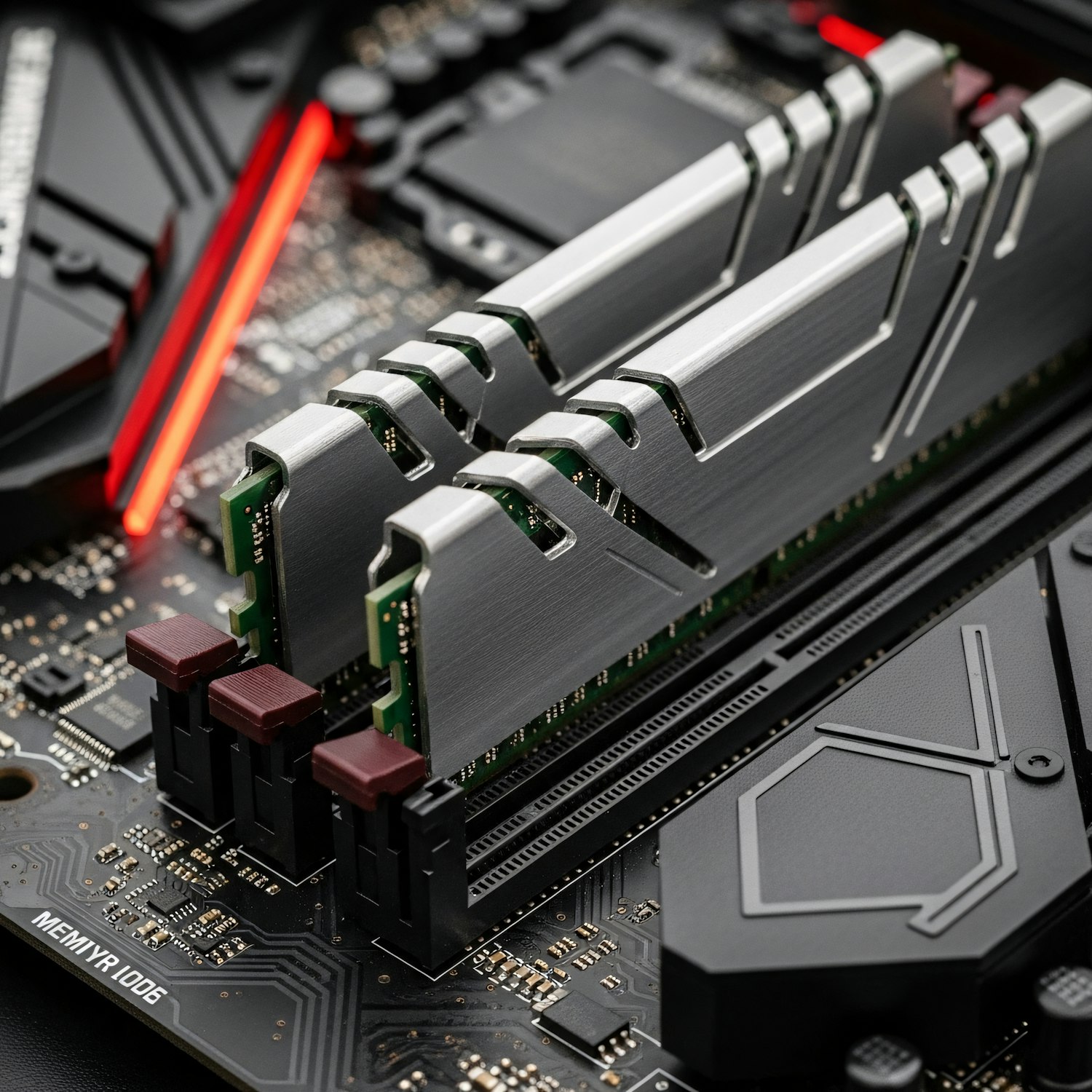 Close-up of a motherboard with two RAM modules installed, featuring sleek metallic heat spreaders and illuminated by a red LED light.