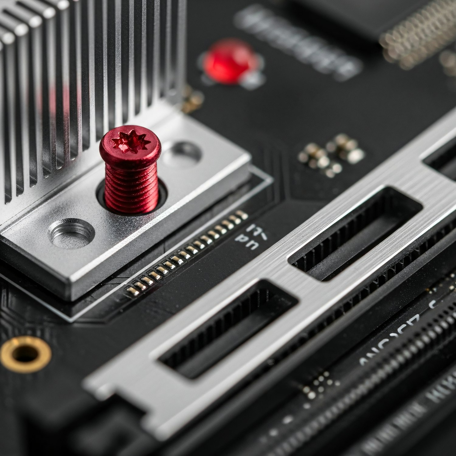 Close-up of a motherboard with a red screw and heatsink, showcasing intricate details of electronic components and PCIe slots.