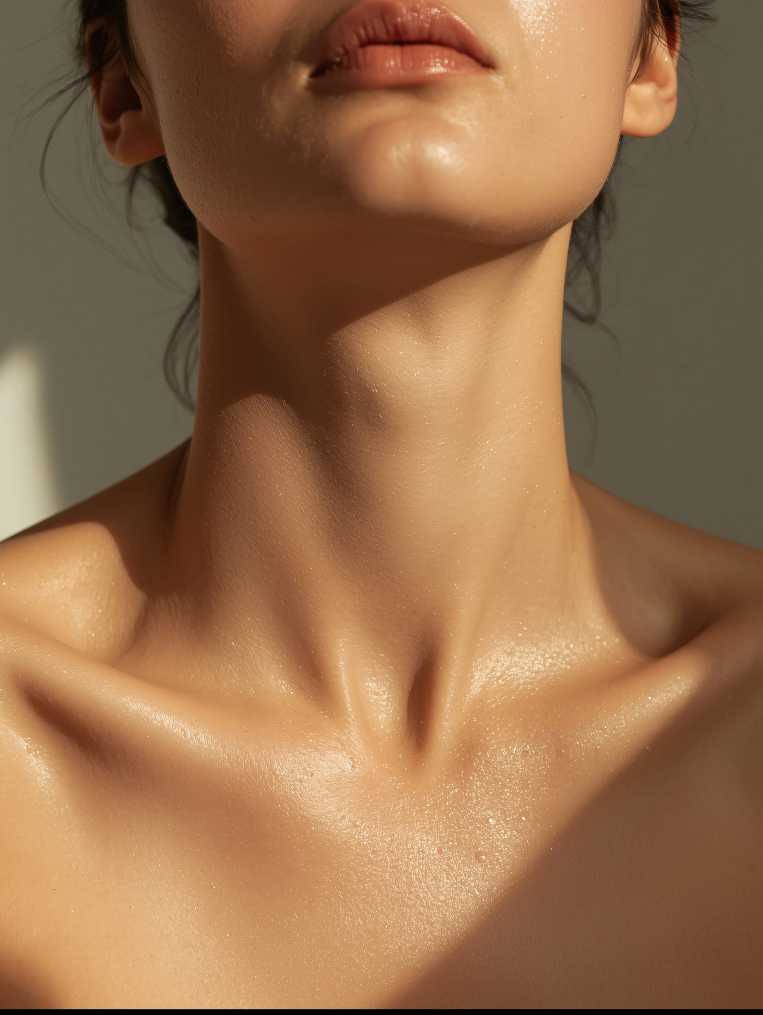 Close-up of a person's neck and collarbone with smooth, glowing skin and natural lighting highlighting the contours.