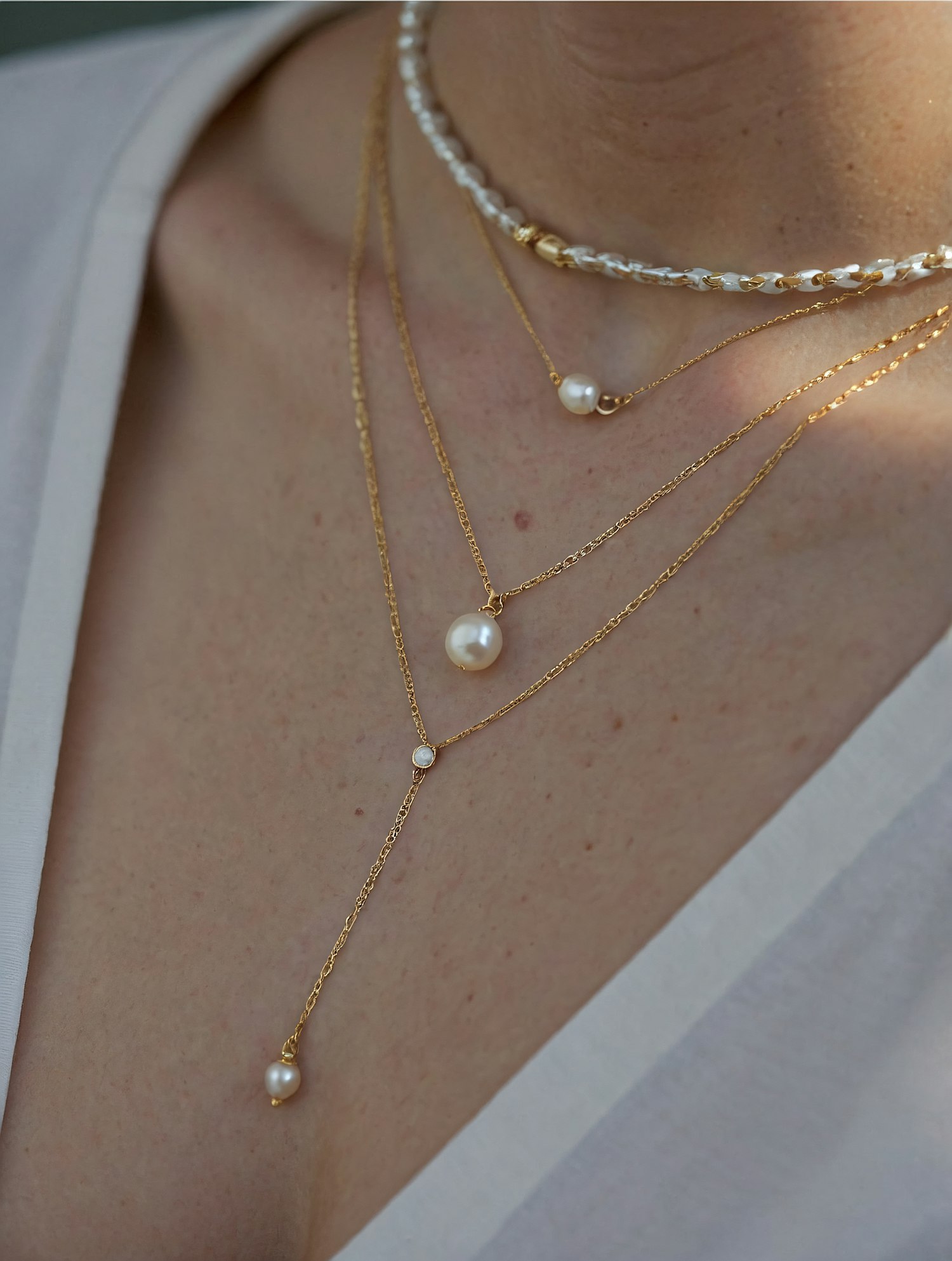 Elegant layered necklaces with pearls and gold chains on a light-skinned neck, featuring a white braided choker.
