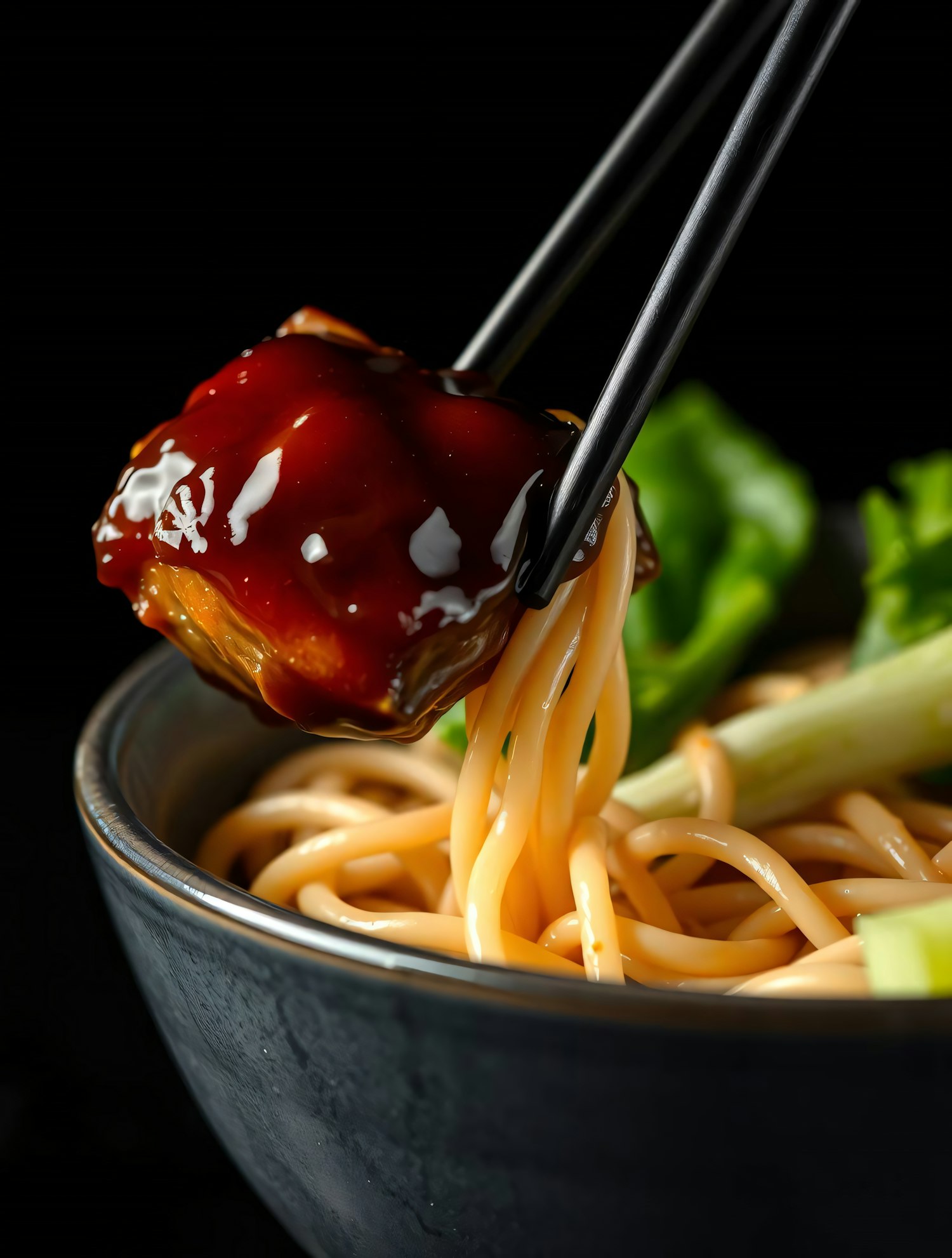 Close-up of noodles with glazed meat lifted by chopsticks, featuring vibrant colors and textures in a dark bowl.