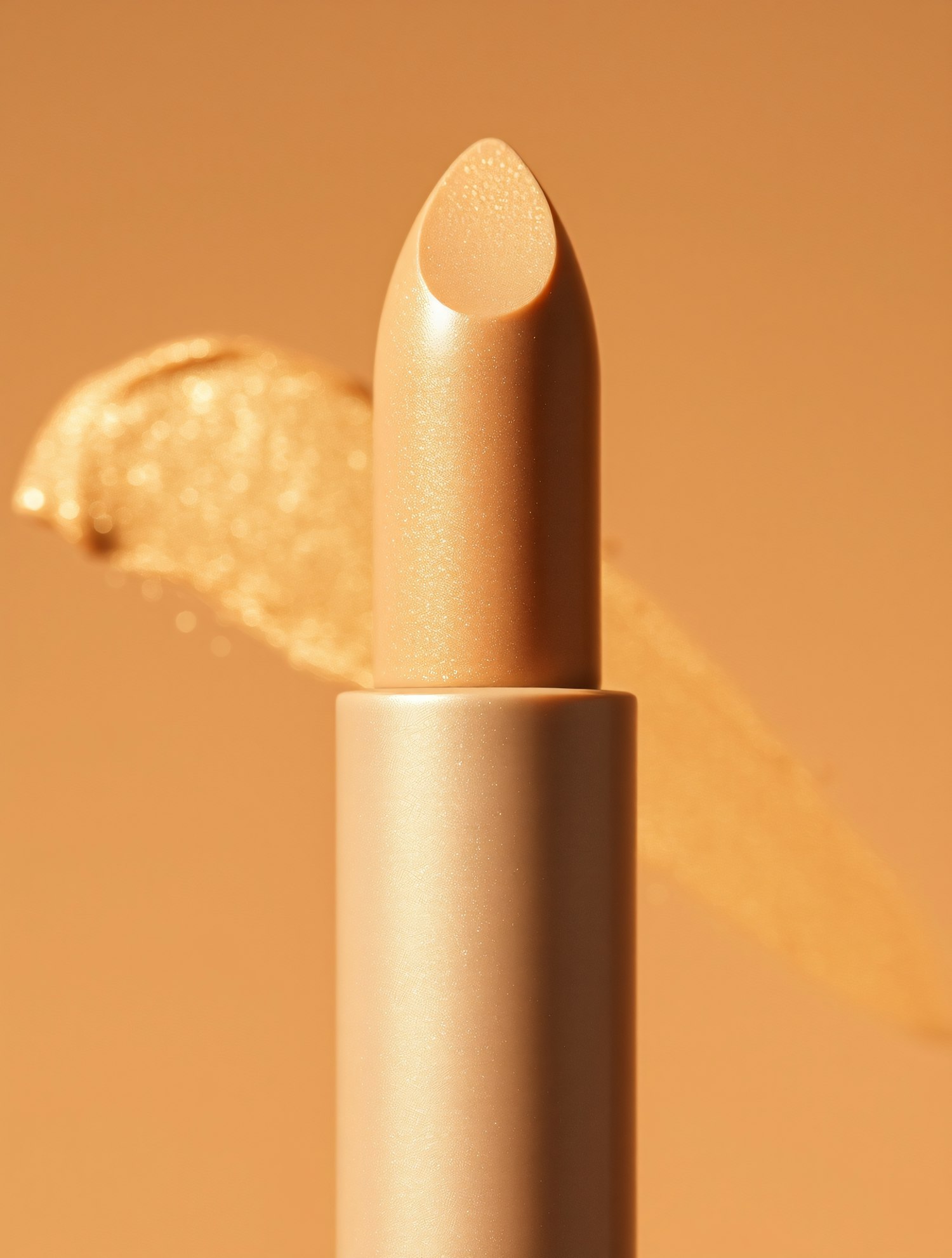 Close-up of a nude lipstick with a warm shimmer, set against a matching beige background. Elegant and luxurious beauty product.