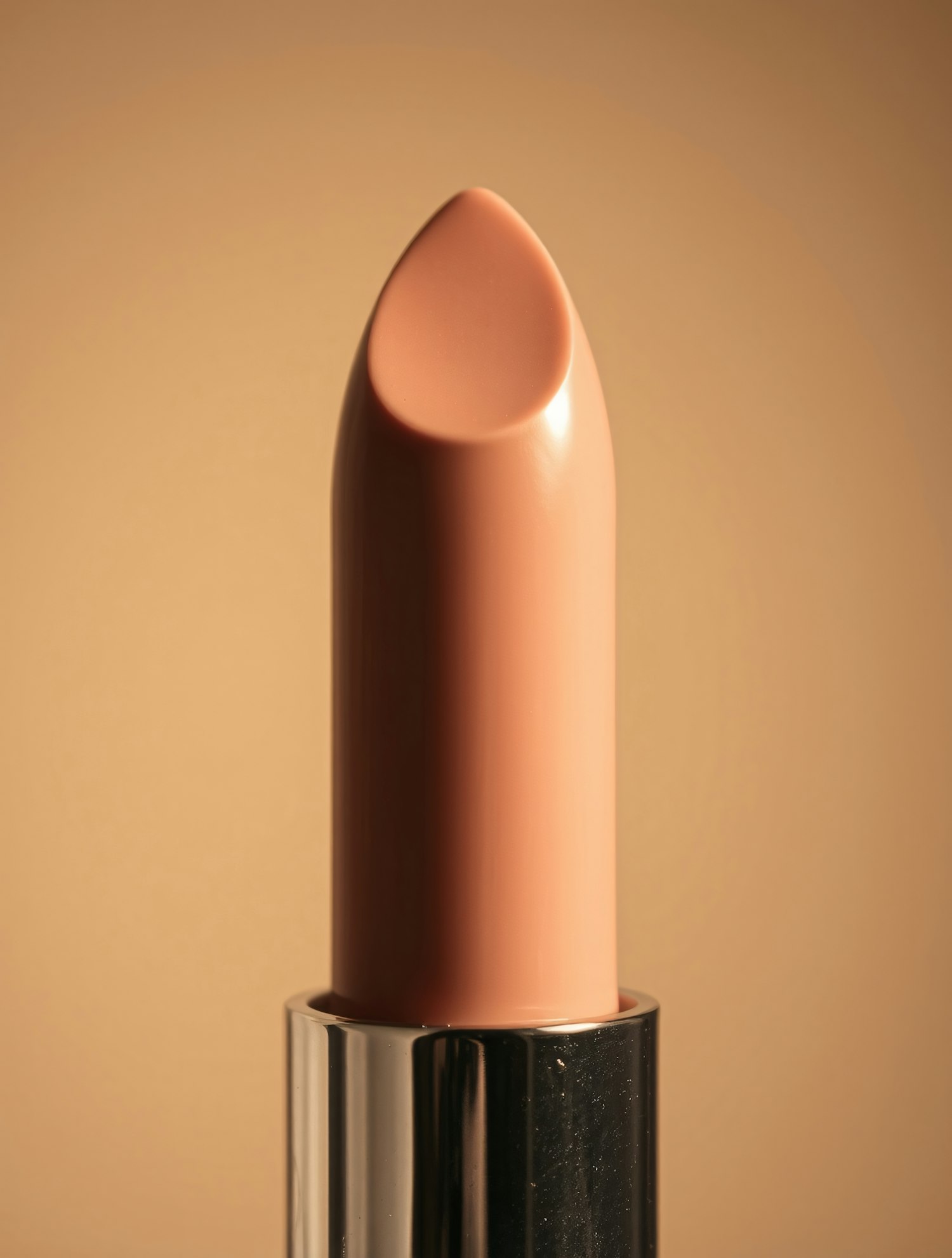 Close-up of a nude lipstick in a sleek silver tube against a warm beige background, highlighting its smooth, glossy texture.