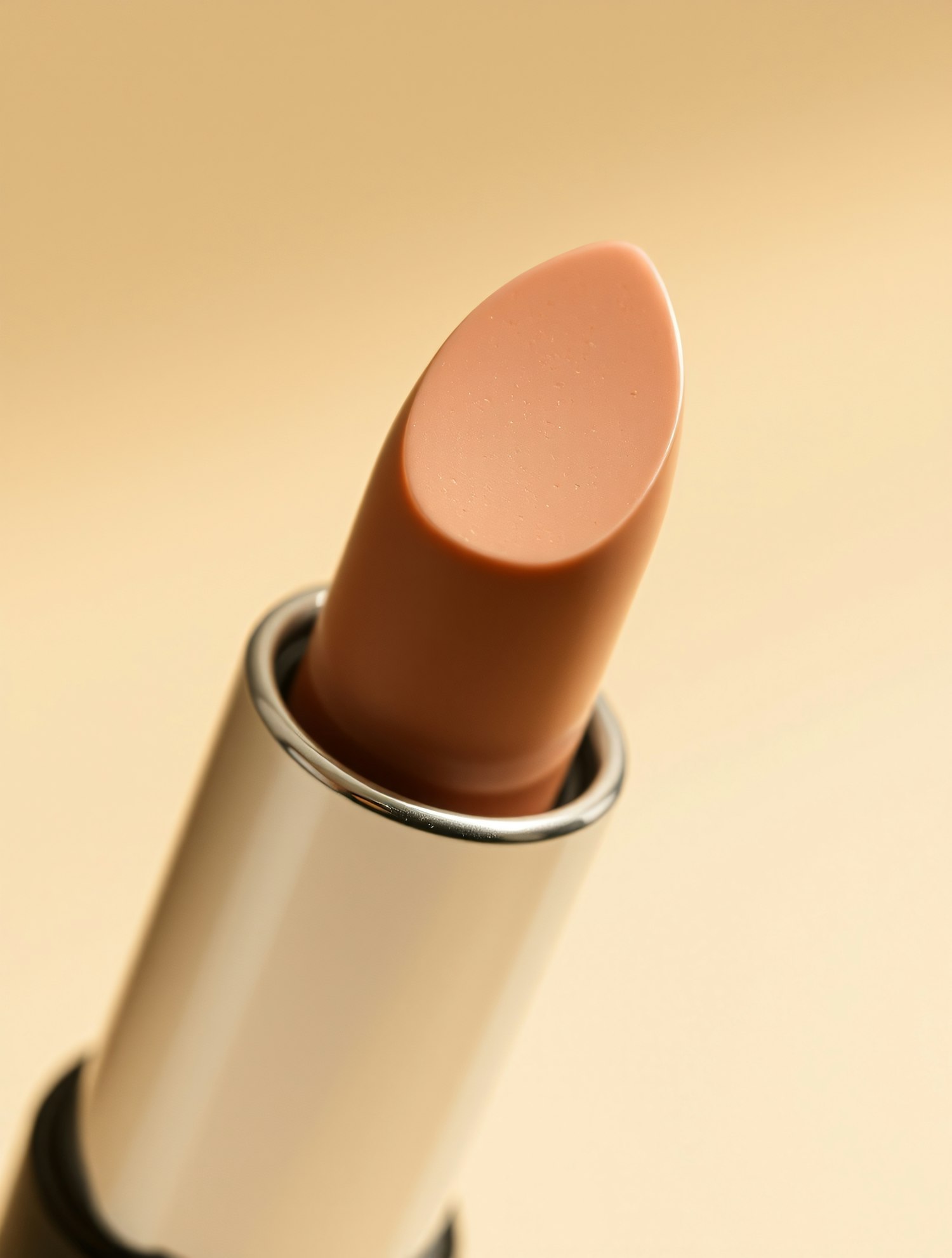 Close-up of a nude lipstick in a sleek metallic tube against a beige background, showcasing its creamy texture and elegant design.