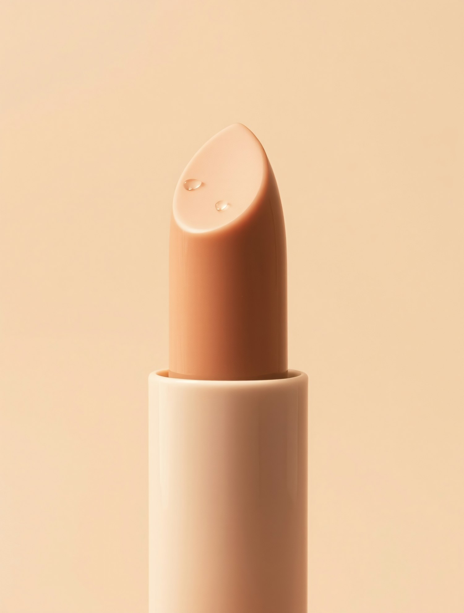 Minimalist close-up of a beige lipstick with water droplets on its tip, set against a matching beige background.