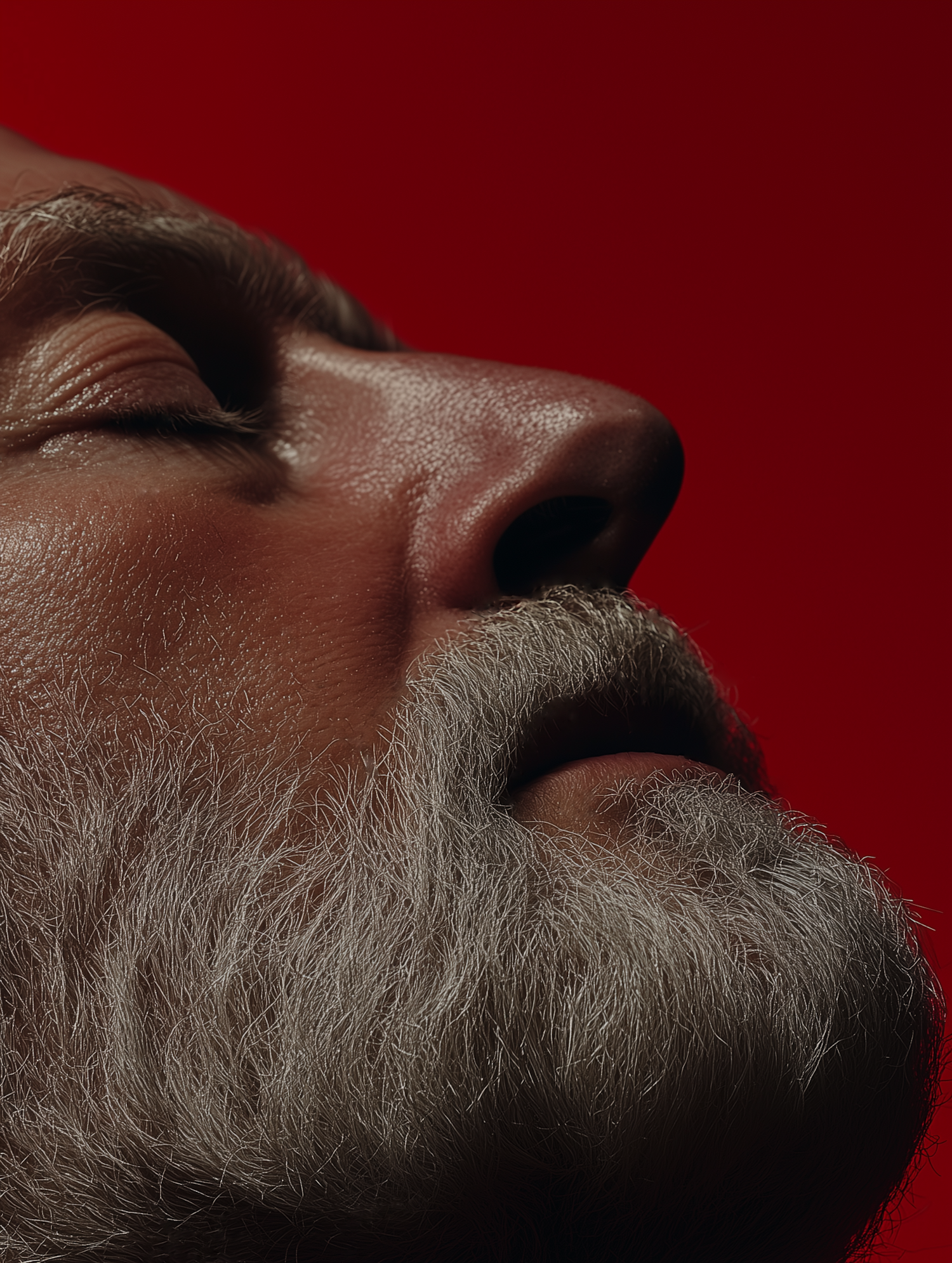 Close-up of an elderly man with a white beard against a vibrant red background, eyes closed, serene expression.